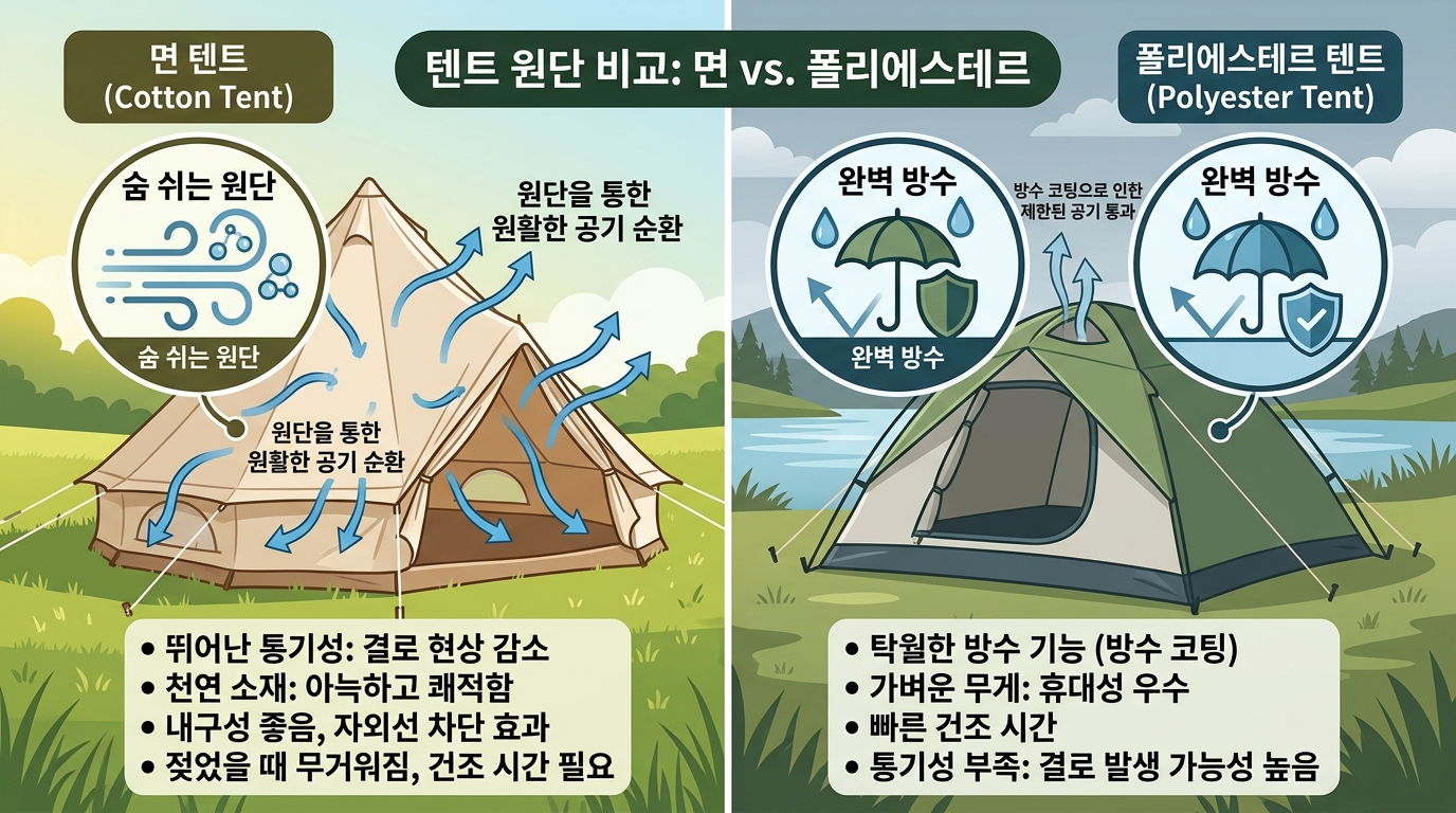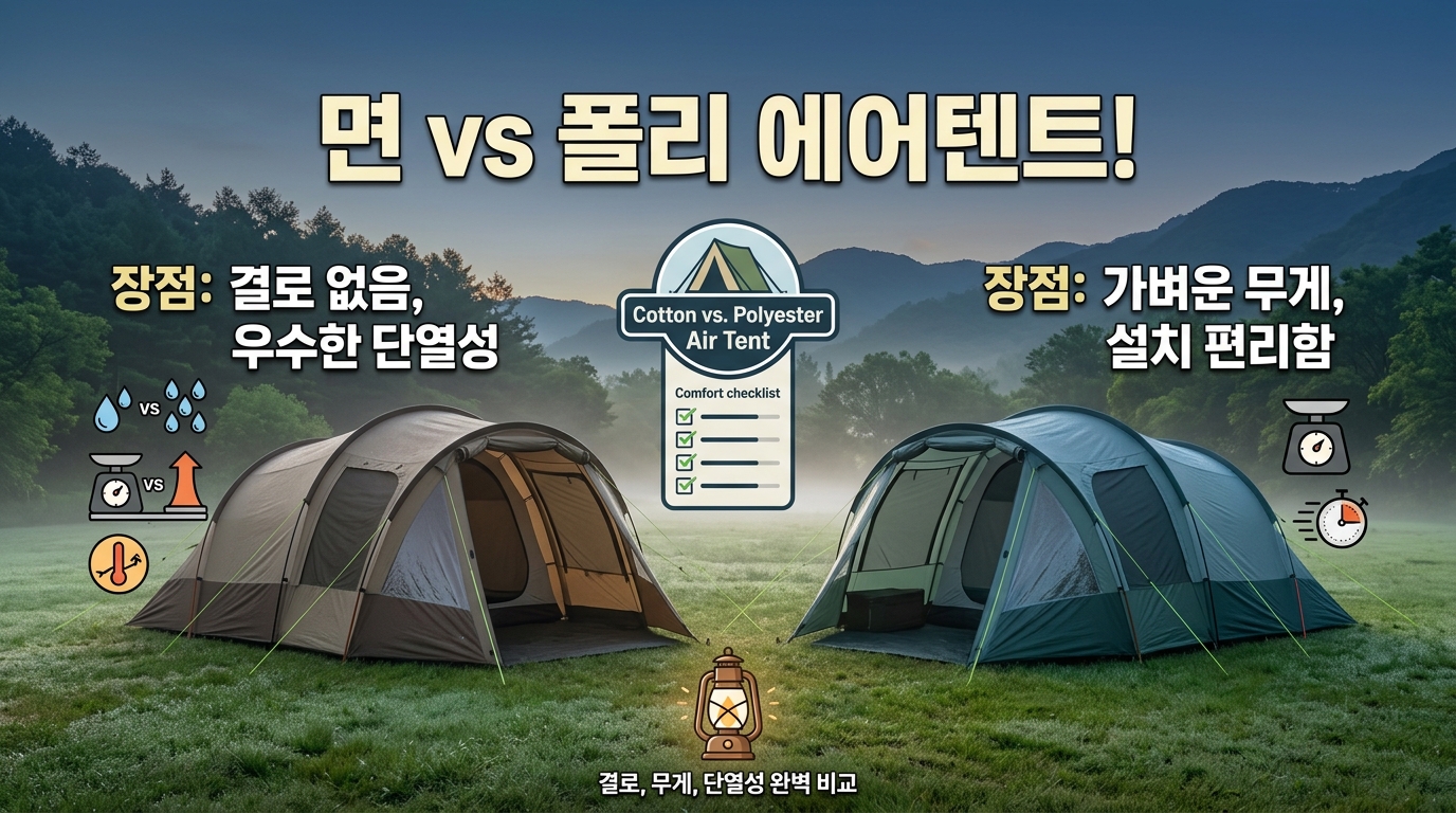 [결로 없는 캠핑, 에어텐트 소재가 답일까?] 캠핑의 질을 결정짓는 텐트 소재! 면 혼방과 폴리에스터 에어텐트 사이에서 고민 중인 분들을 위해 30년 교육 현장의 꼼꼼함으로 결로, 보온성, 관리법을 완벽 비교해 드립니다. 😊