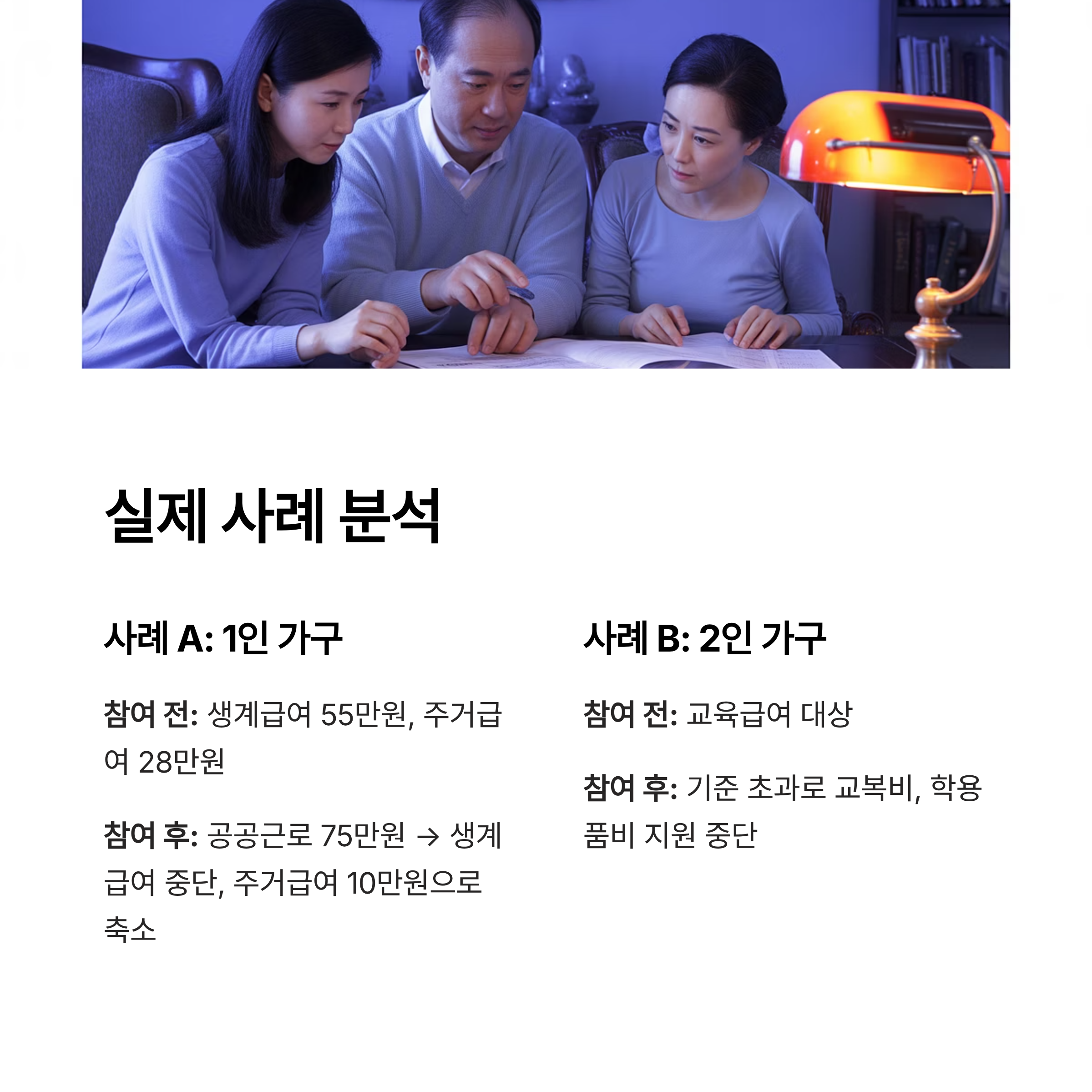 💡 1인 가구 A씨는 기초생활보장 수급자로 매월 생계급여 55만 원, 주거급여 28만 원을 받고 있었어요. 공공근로에 참여해 월 75만 원의 급여를 받기 시작했고, 그 결과 생계급여는 중단, 주거급여도 10만 원으로 줄었어요.