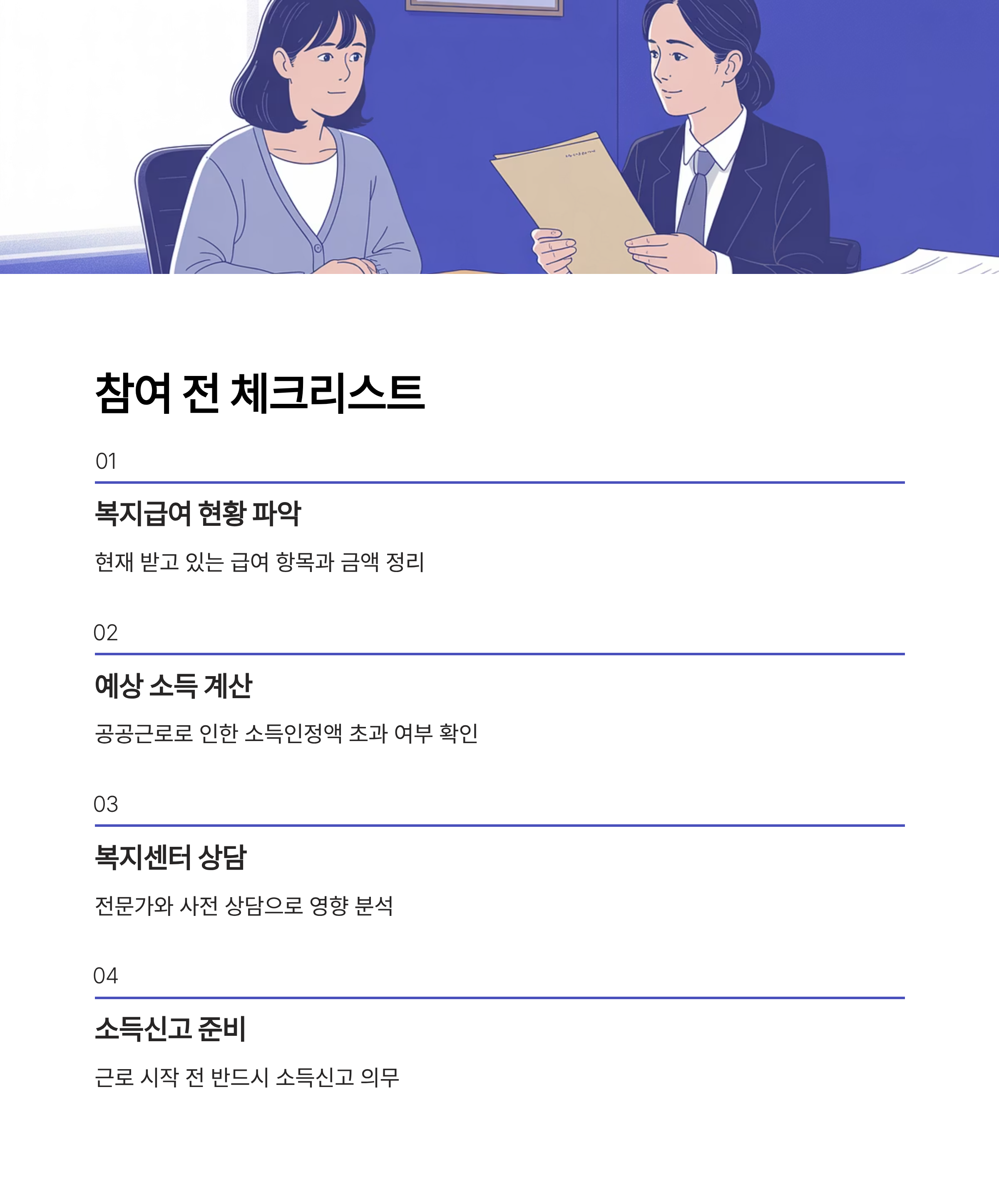 공공근로 사업 참여를 앞두고 있다면, 단순히 일자리만 바라보기보다 복지 전체 흐름을 이해하고 준비하는 것이 좋아요. 아래 체크리스트는 꼭 참고해두세요!