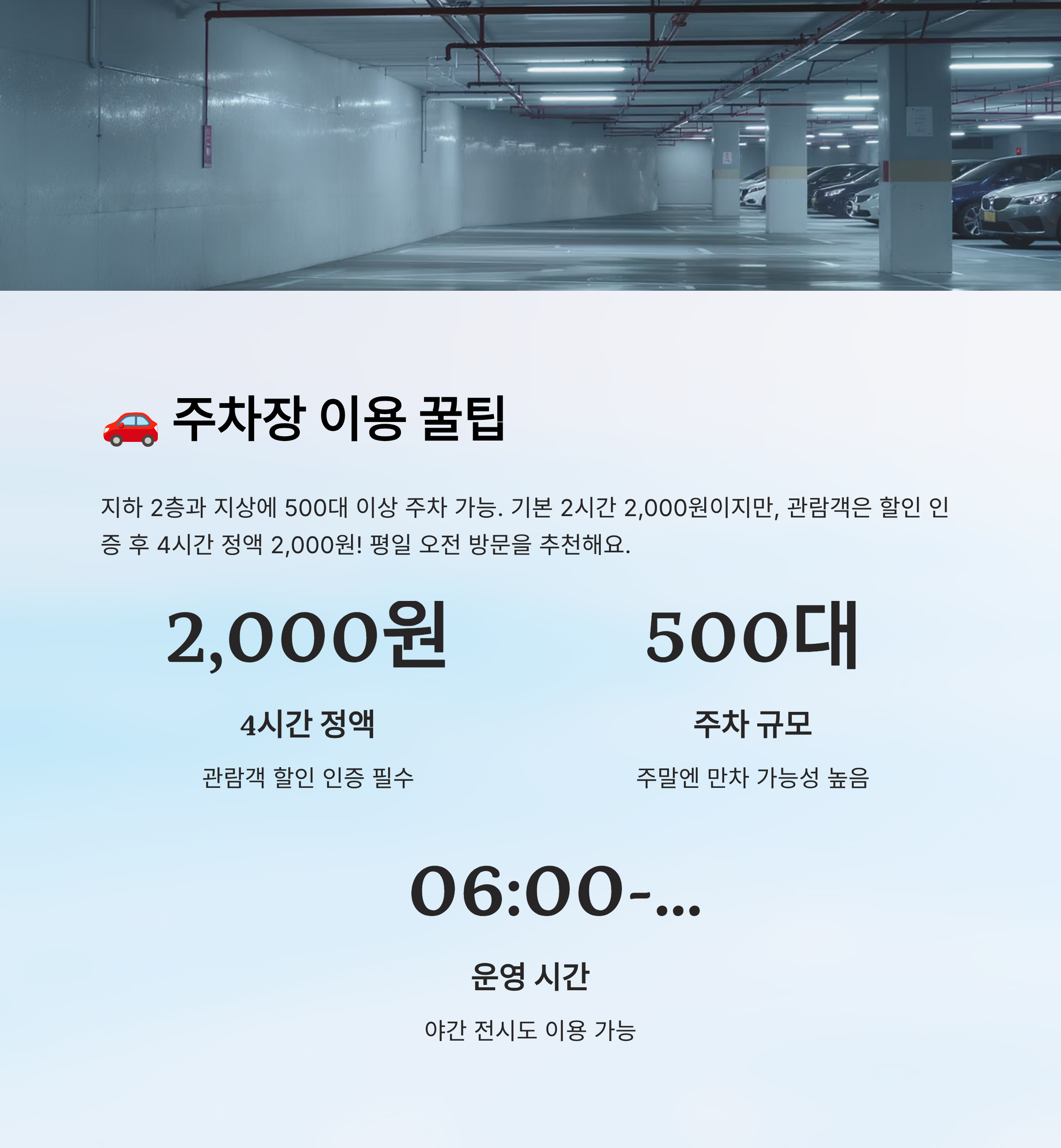 주차 관련 정보만 잘 알고 있어도 하루 일정이 훨씬 수월해져요. 다음은 드디어 핵심 전시 정보입니다!