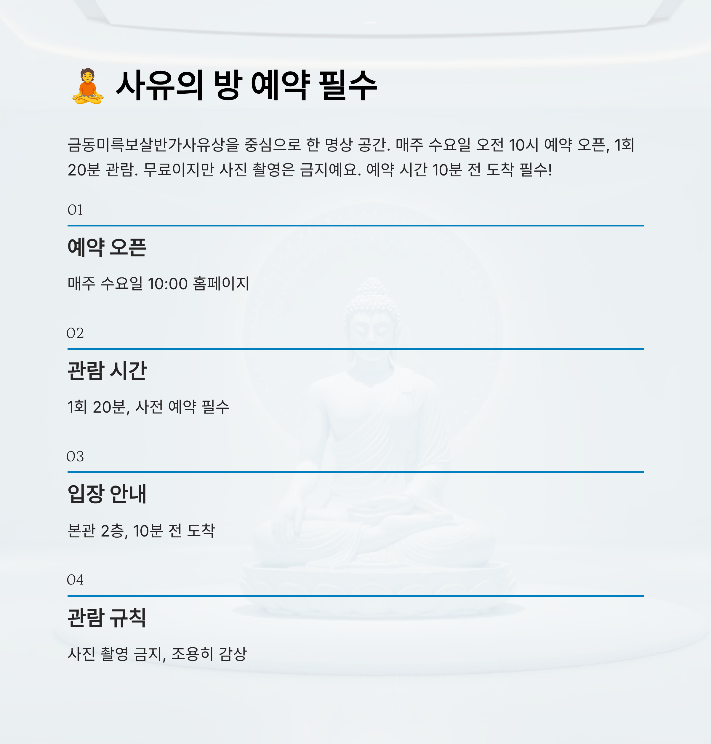 ‘사유의 방’은 국립중앙박물관에서 가장 조용하고 아름다운 명상 공간이에요. 금동미륵보살반가사유상을 중심으로 설치된 이 공간은 단순한 전시를 넘어 ‘내면과의 대화’를 위한 명소로 불려요.