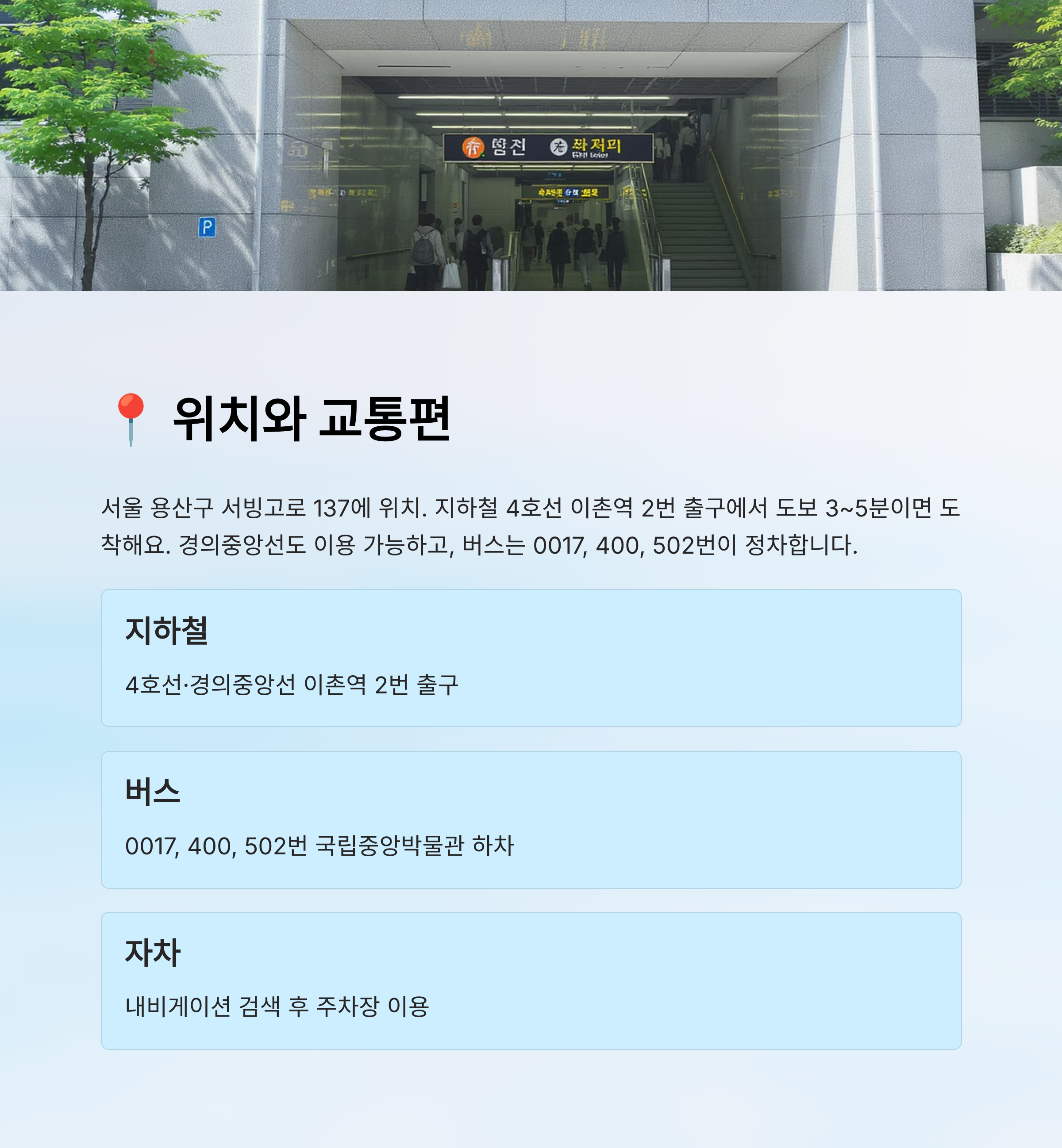 또한 버스 이용도 편리해요. '국립중앙박물관 정류장'에는 0017, 400, 502번 버스가 정차해요. 대중교통만으로도 전혀 불편함 없이 도착 가능해서, 주말에도 많은 사람들이 찾는 장소예요.