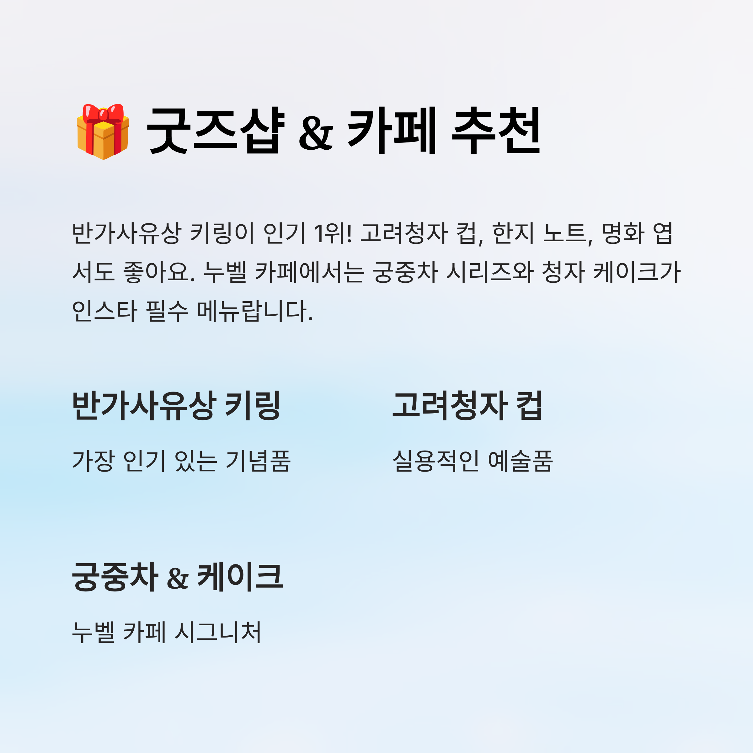 가장 인기 있는 굿즈는 단연 ‘반가사유상 키링’이에요. 작지만 섬세하게 조각된 미니어처가 소장욕구를 불러일으키고, 가격도 부담 없어 선물용으로도 좋아요. 그 외에도 고려청자 컵, 한지 노트, 역사적 명화 엽서 등도 인기가 많아요.