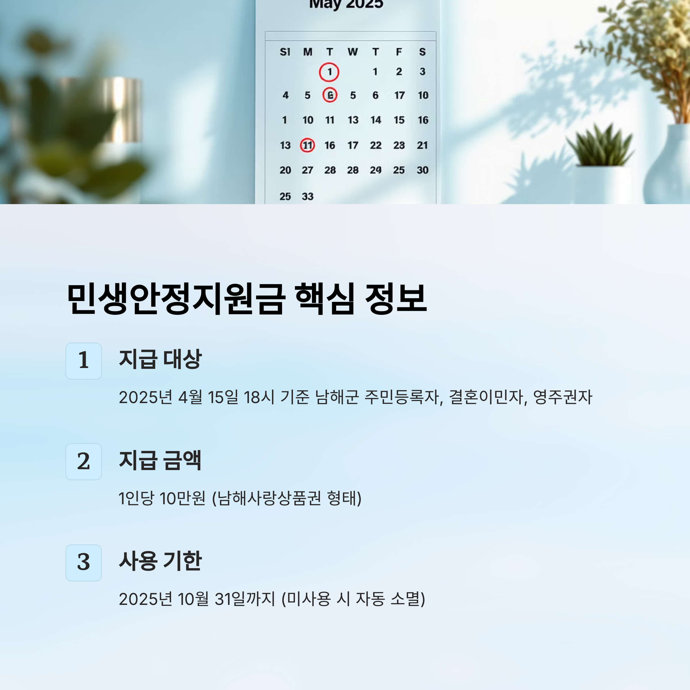 지급 대상은 2025년 4월 15일 18시 기준으로 남해군에 주민등록을 둔 군민, 결혼이민자, 체류하는 영주권자 등 폭넓게 포함돼요. 특히 세대주가 세대원 몫까지 한 번에 신청하고 받을 수 있어 절차가 간편하답니다.