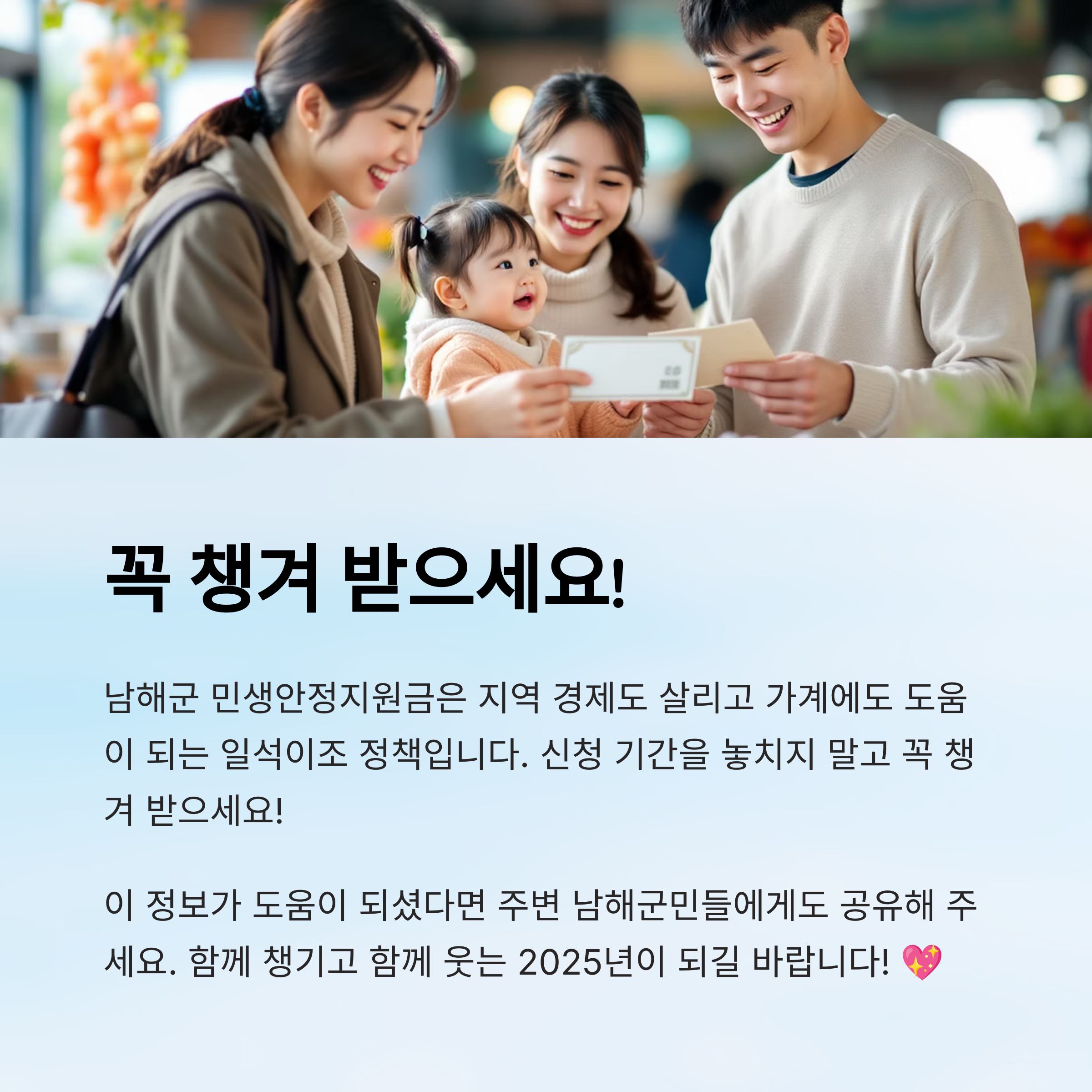 그래서 남해군은 이번 지원금을 단순한 소비 촉진이 아니라, 지역 소상공인과 주민 모두를 살리는 종합 정책으로 연계하려 하고 있어요. 참 좋은 방향이죠!