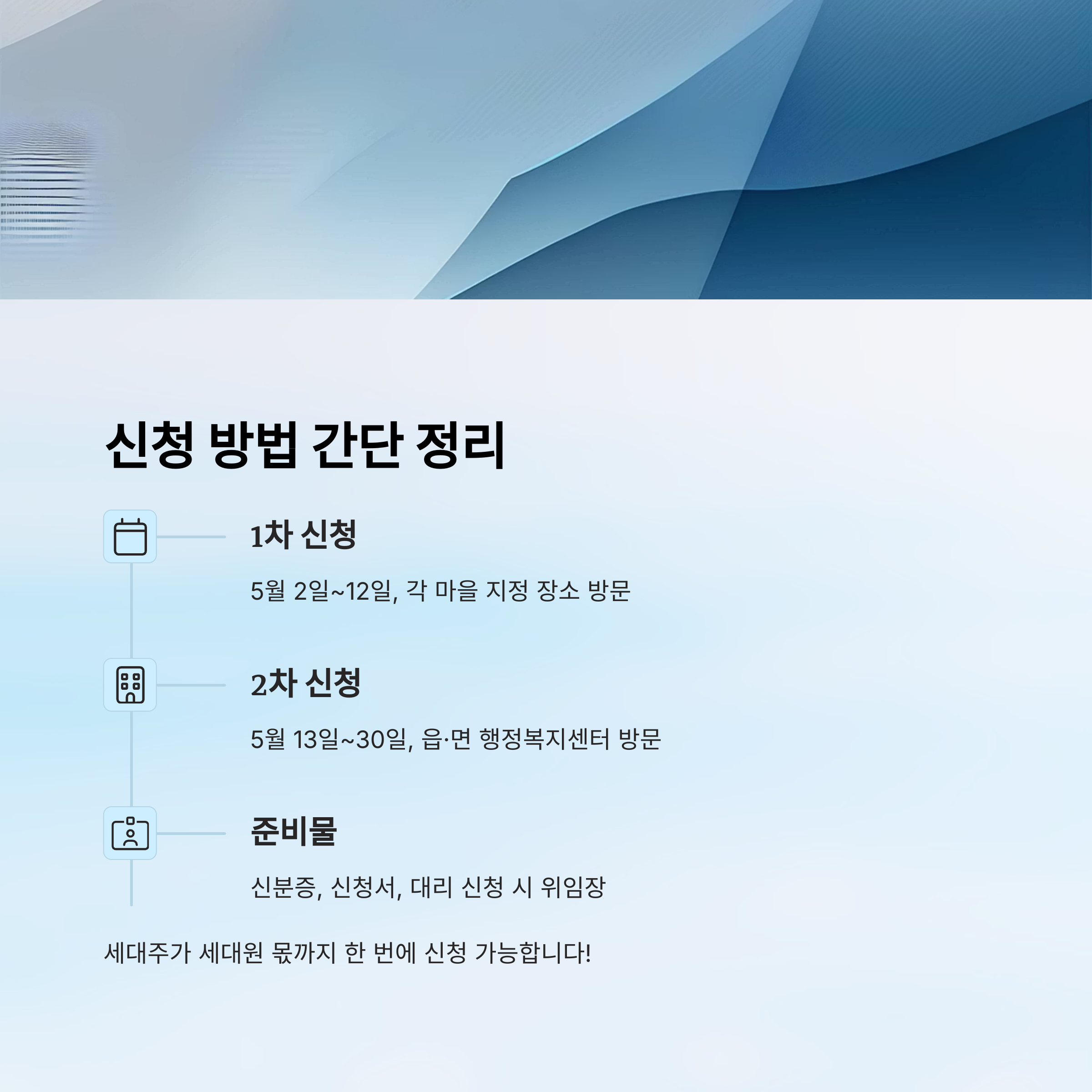1차 신청은 2025년 5월 2일부터 12일까지 각 마을 지정 장소에서 진행돼요. 2차는 5월 13일부터 30일까지 주소지 읍·면 행정복지센터를 방문해 신청할 수 있어요.