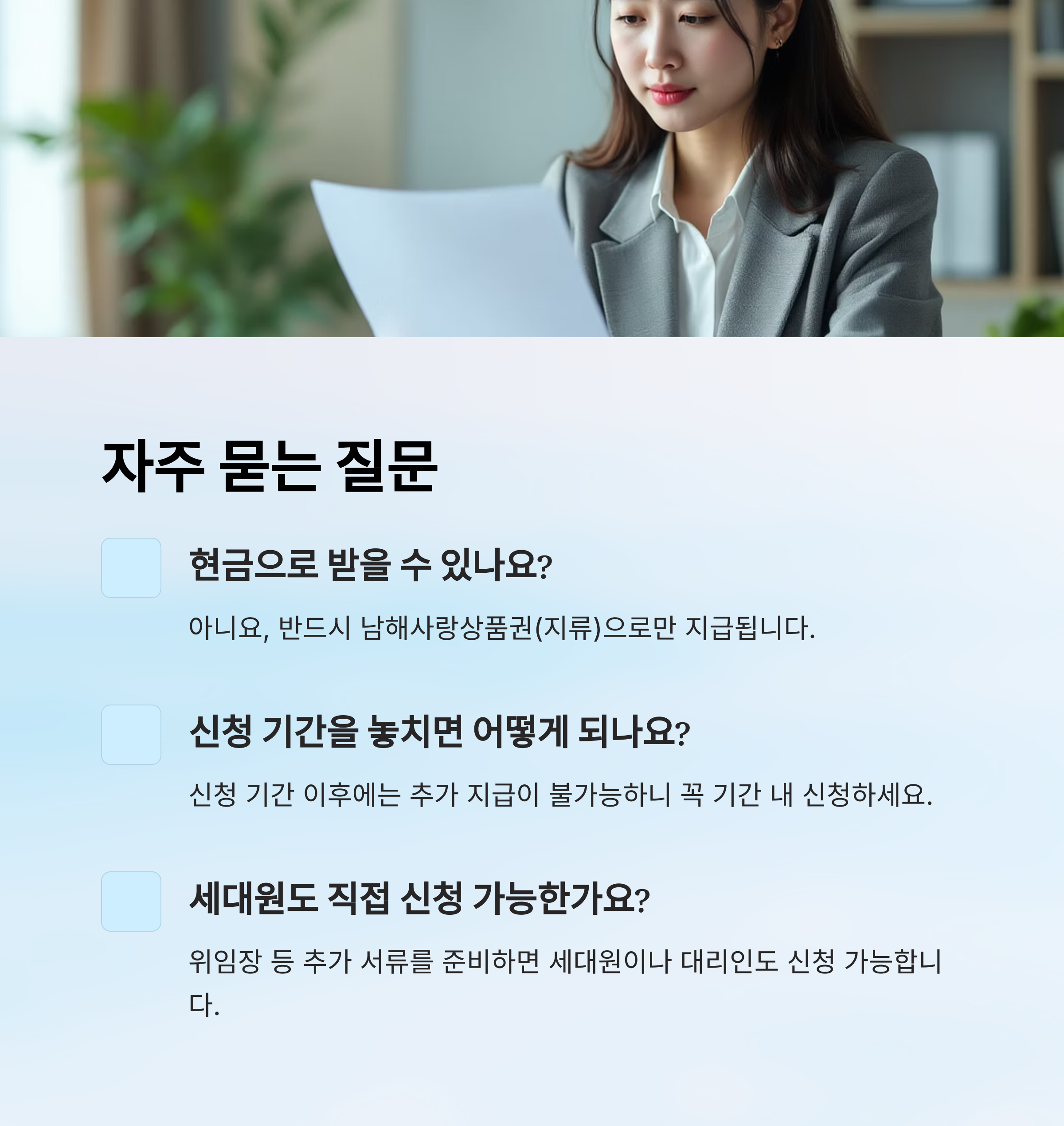 A5. 아니요. 현금이 아니라 반드시 남해사랑상품권(지류)으로 지급돼요. 현금 전환은 불가해요.