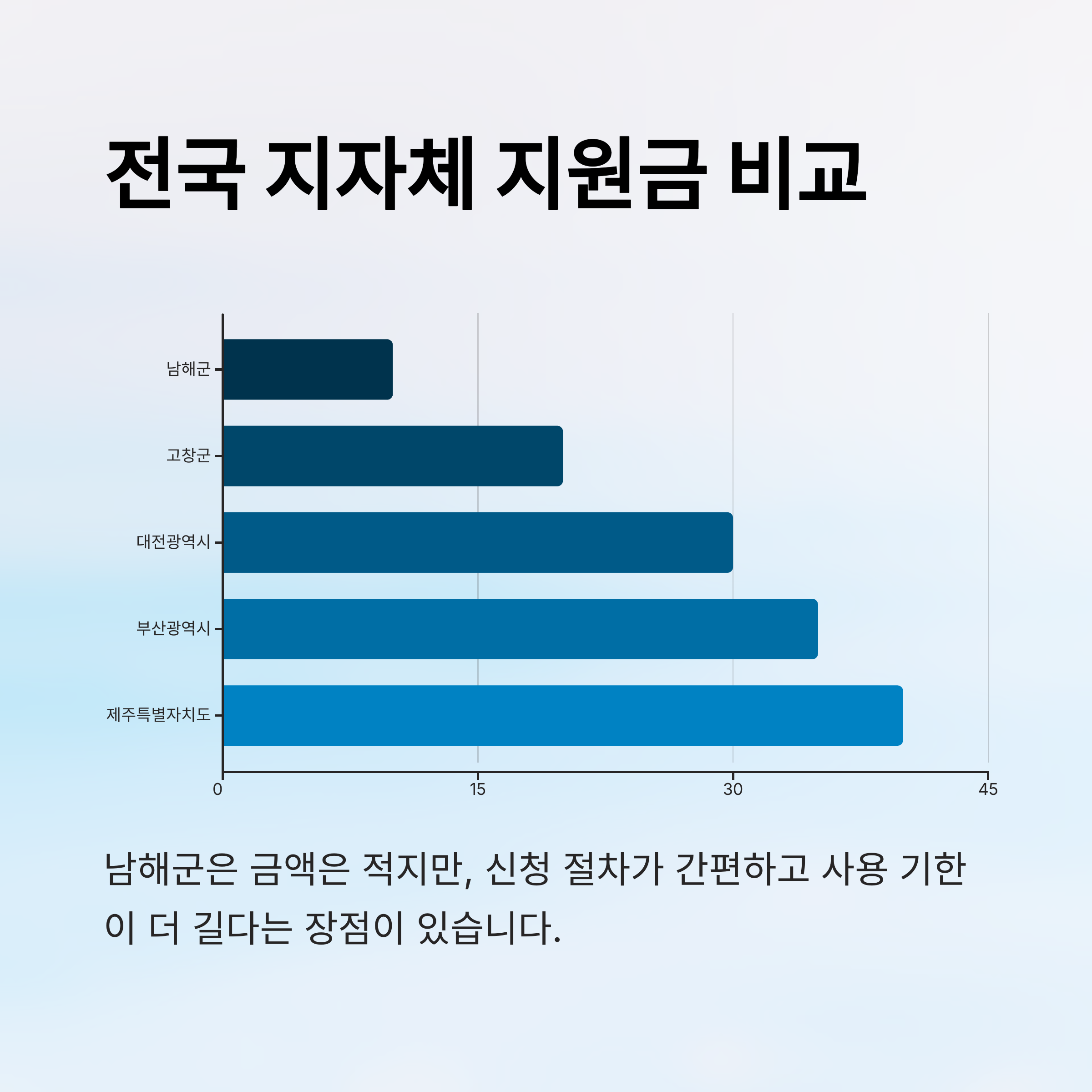 지원금 액수만 보면 아쉽지만, 지급 대상이나 신청 절차에서는 남해군이 오히려 더 간편하고 빠르게 진행하고 있어서 긍정적인 부분도 있어요!