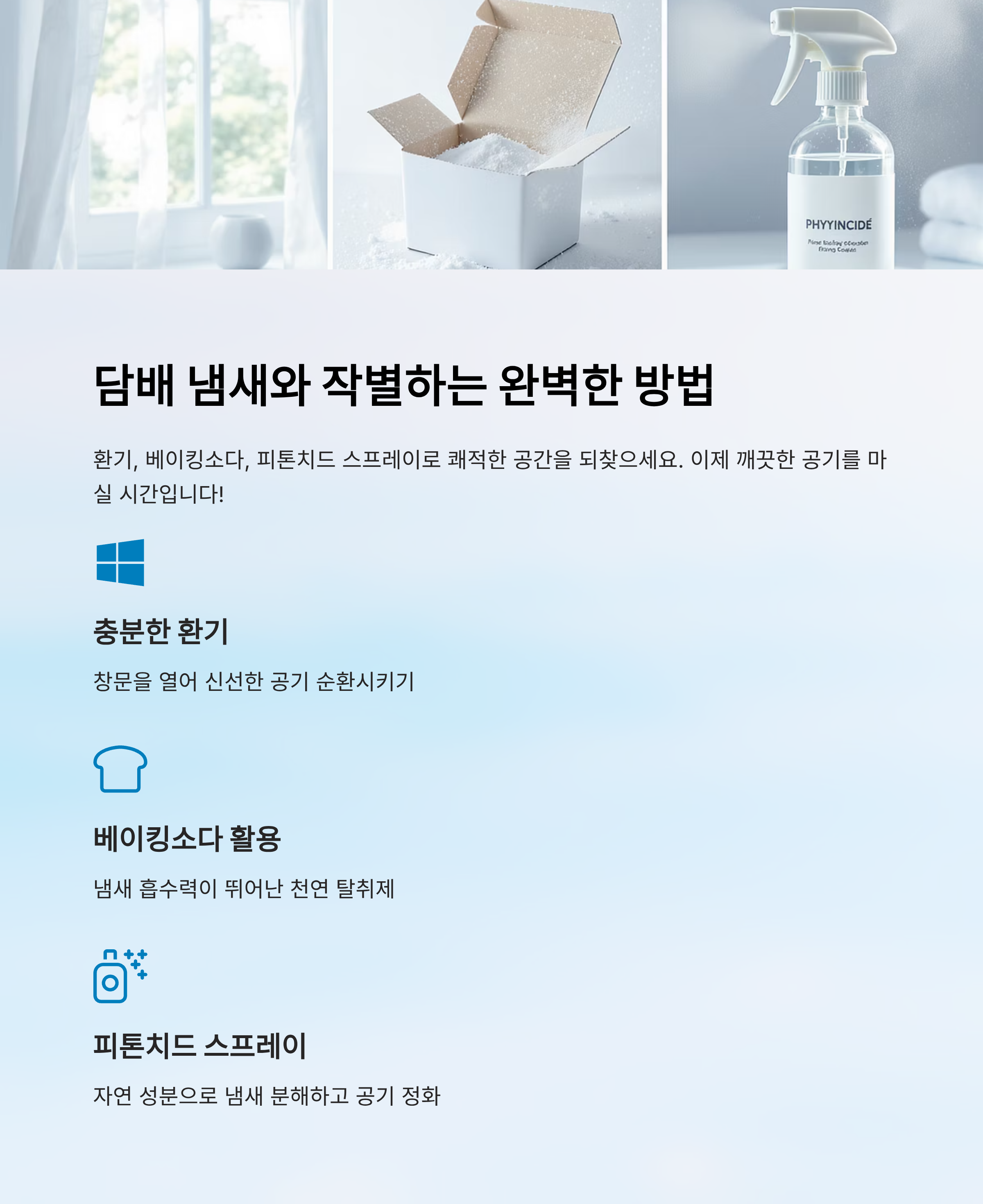 환기를 자주 하고, 냄새를 흡착하는 천연 재료와 분해 효과가 있는 제품을 병행해서 사용해보세요.