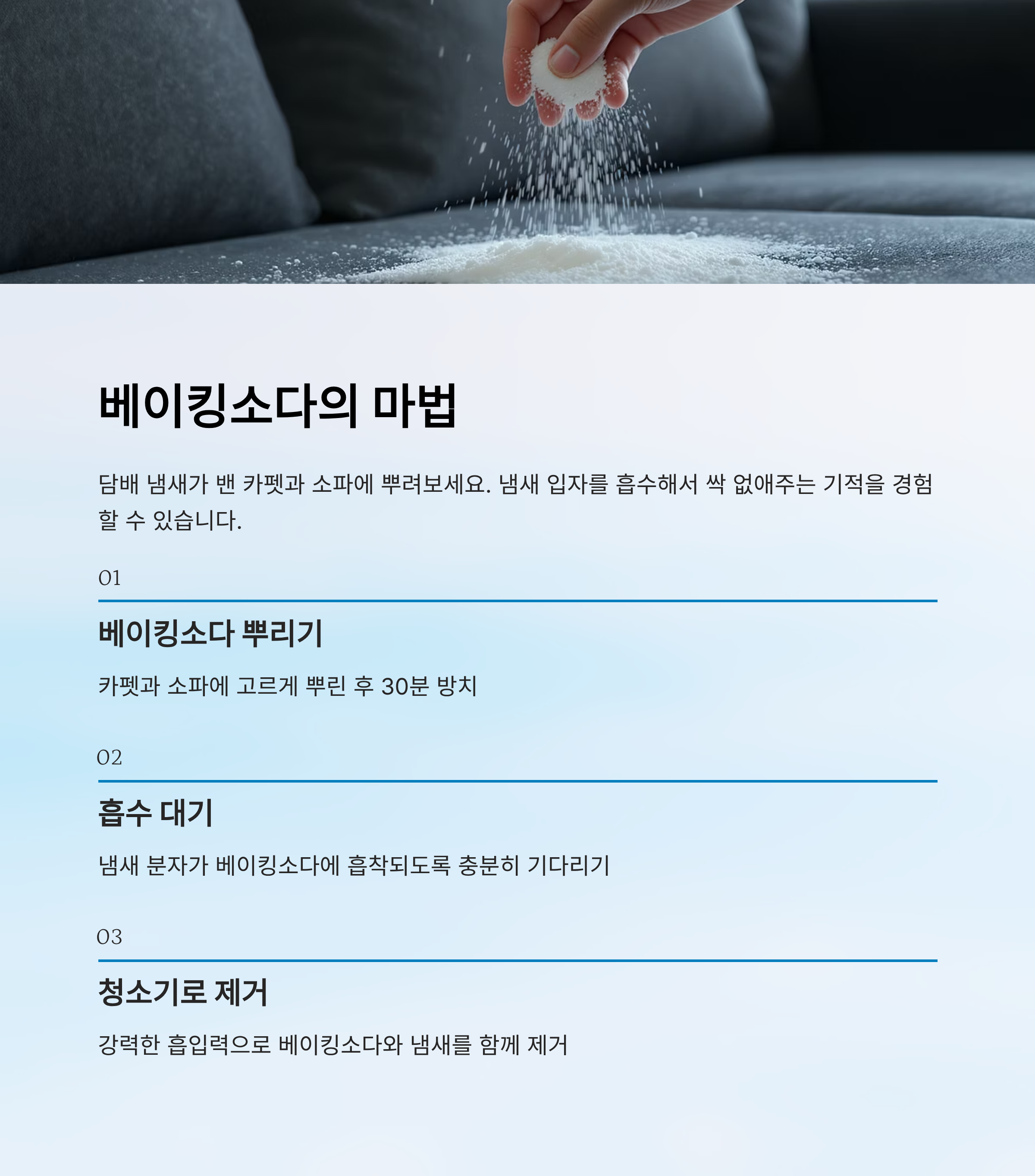 담배 냄새가 밴 카펫이나 소파에 베이킹소다를 얇게 뿌려두고 몇 시간 뒤에 청소기로 빨아들이면,