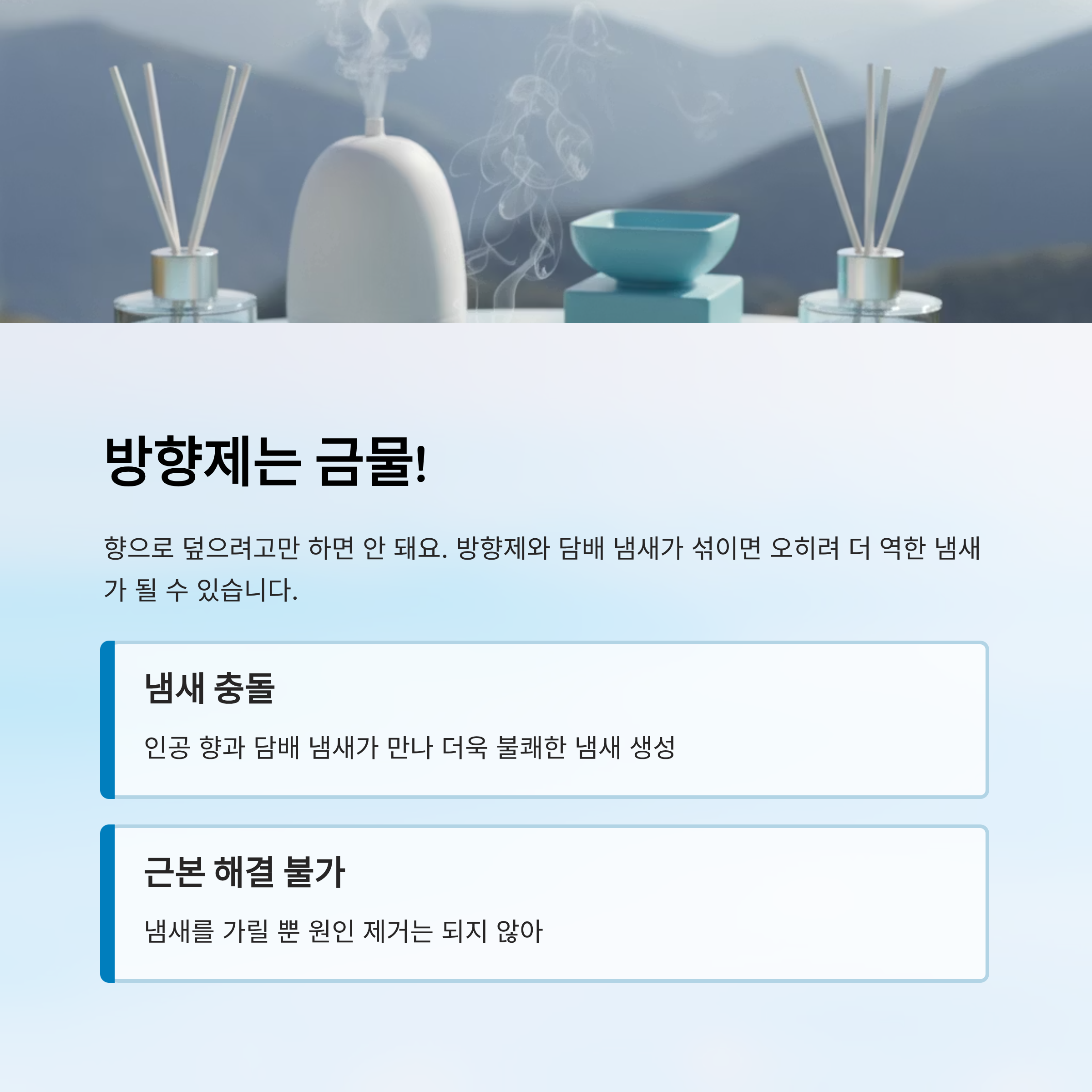 A1. 방향제는 냄새를 덮는 역할만 할 뿐, 근본적인 냄새 원인을 제거하지는 못합니다. 담배 냄새와 섞여 더 불쾌한 냄새를 유발할 수 있으므로, 탈취 효과가 있는 제품과 병행해서 사용하는 것이 좋습니다.