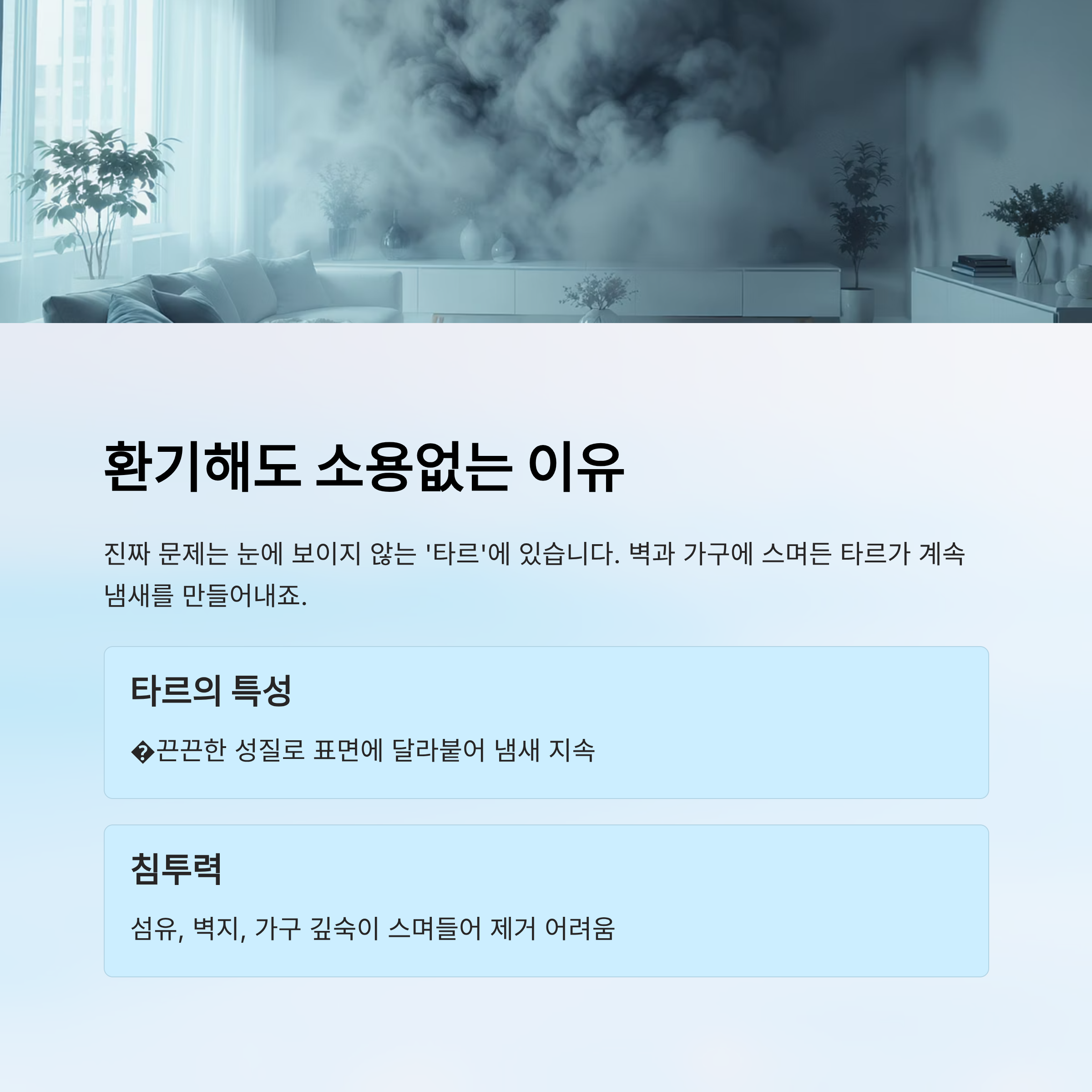 담배 냄새는 '타르' 성분 때문에 깊숙이 스며들어 일반적인 환기로는 제거가 어렵습니다.