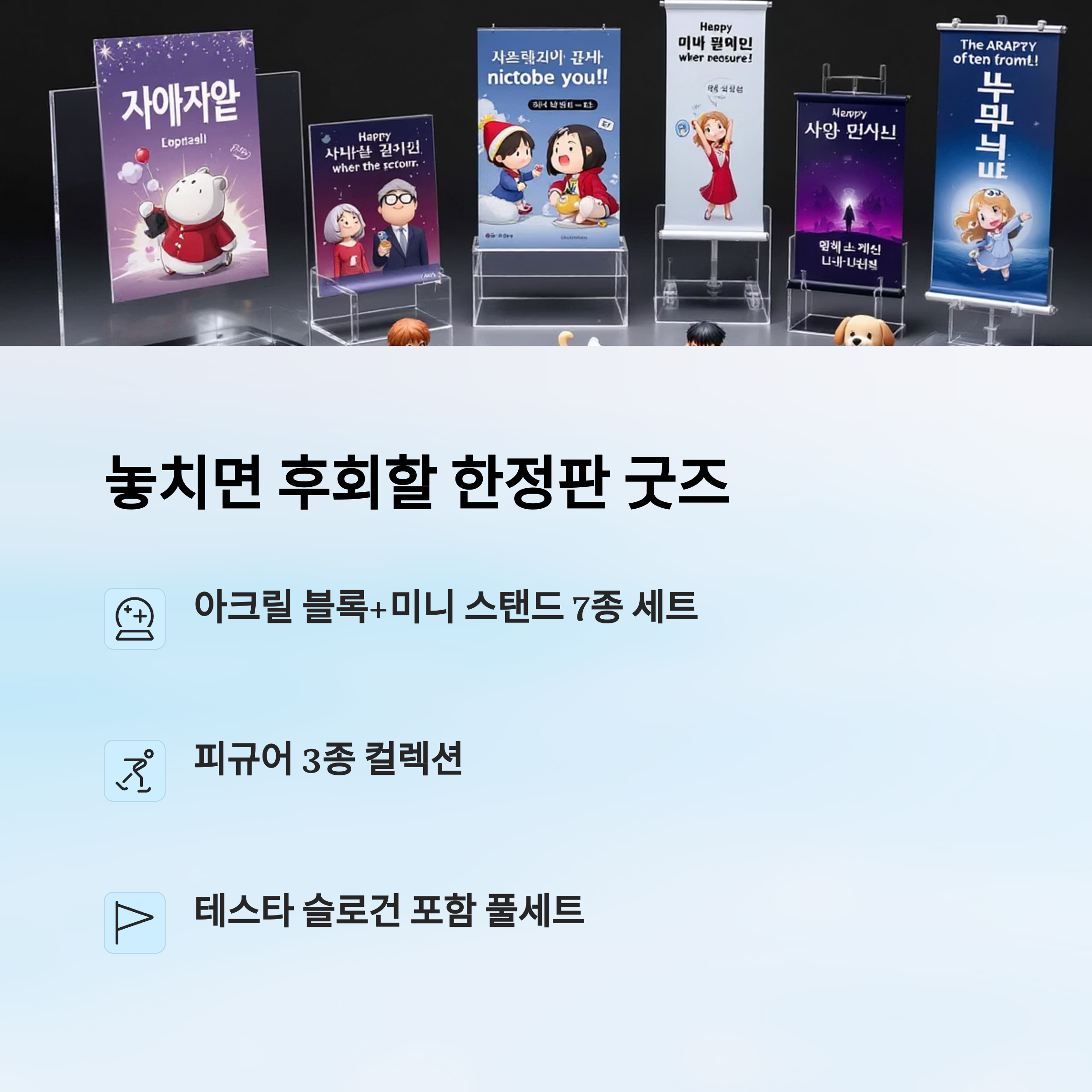 굿즈 구성도 다양해요. 아크릴 블록 세트, 피규어 마그넷, TeSTAR 양면 슬로건 등 팬이라면 무조건 갖고 싶은 아이템이 가득! 특히 아크릴 블록은 SD 일러스트로 제작돼 귀여움 폭발이에요. 😍