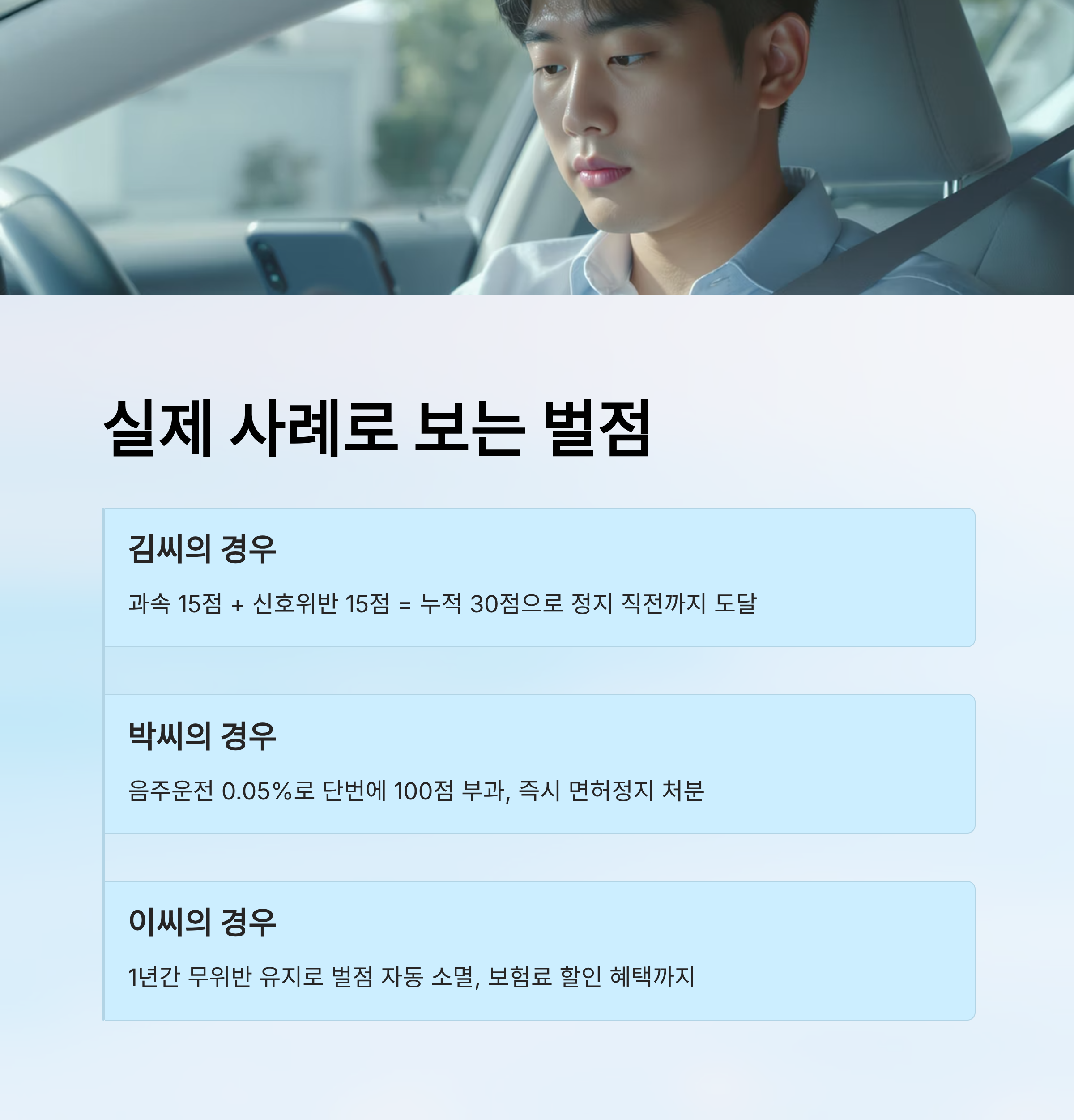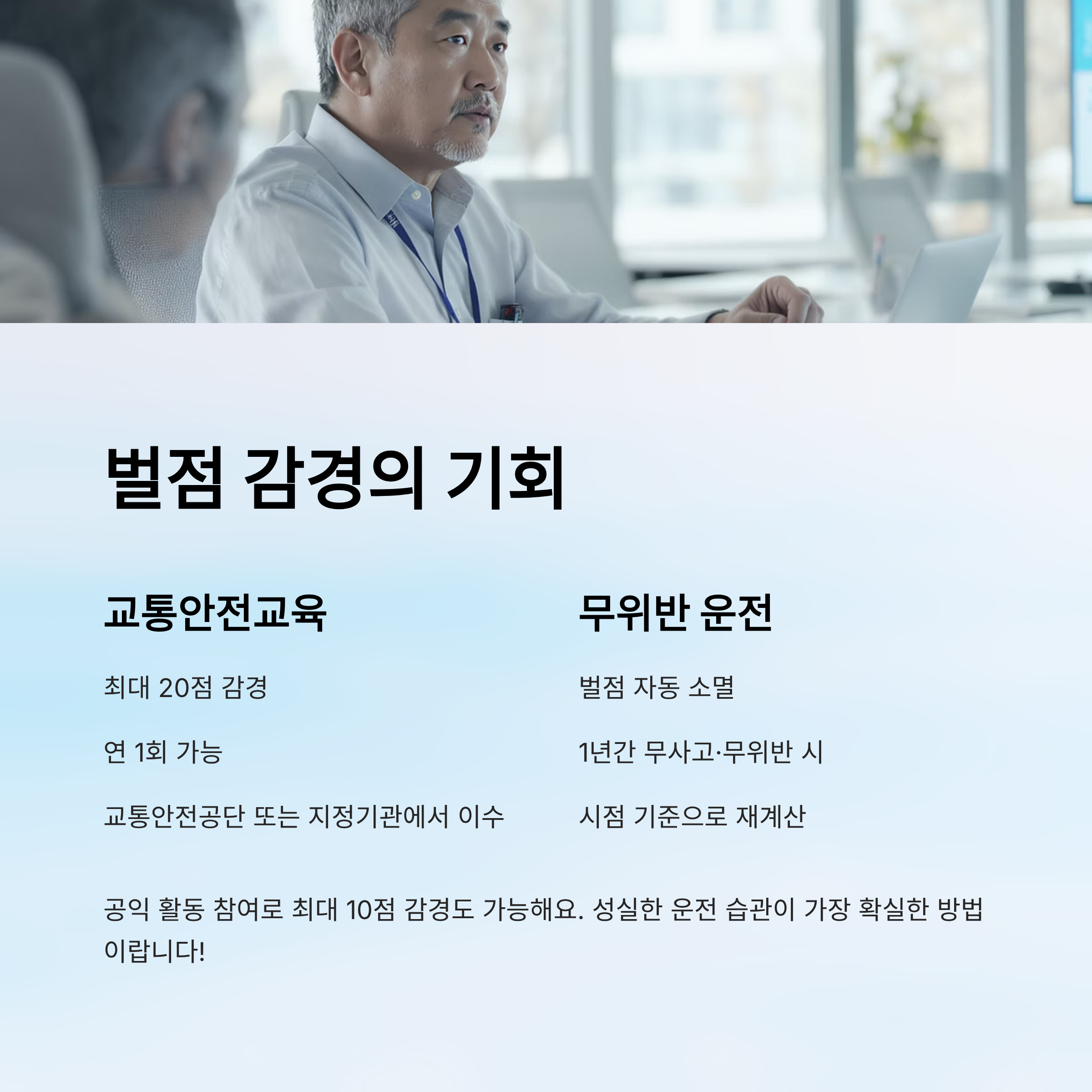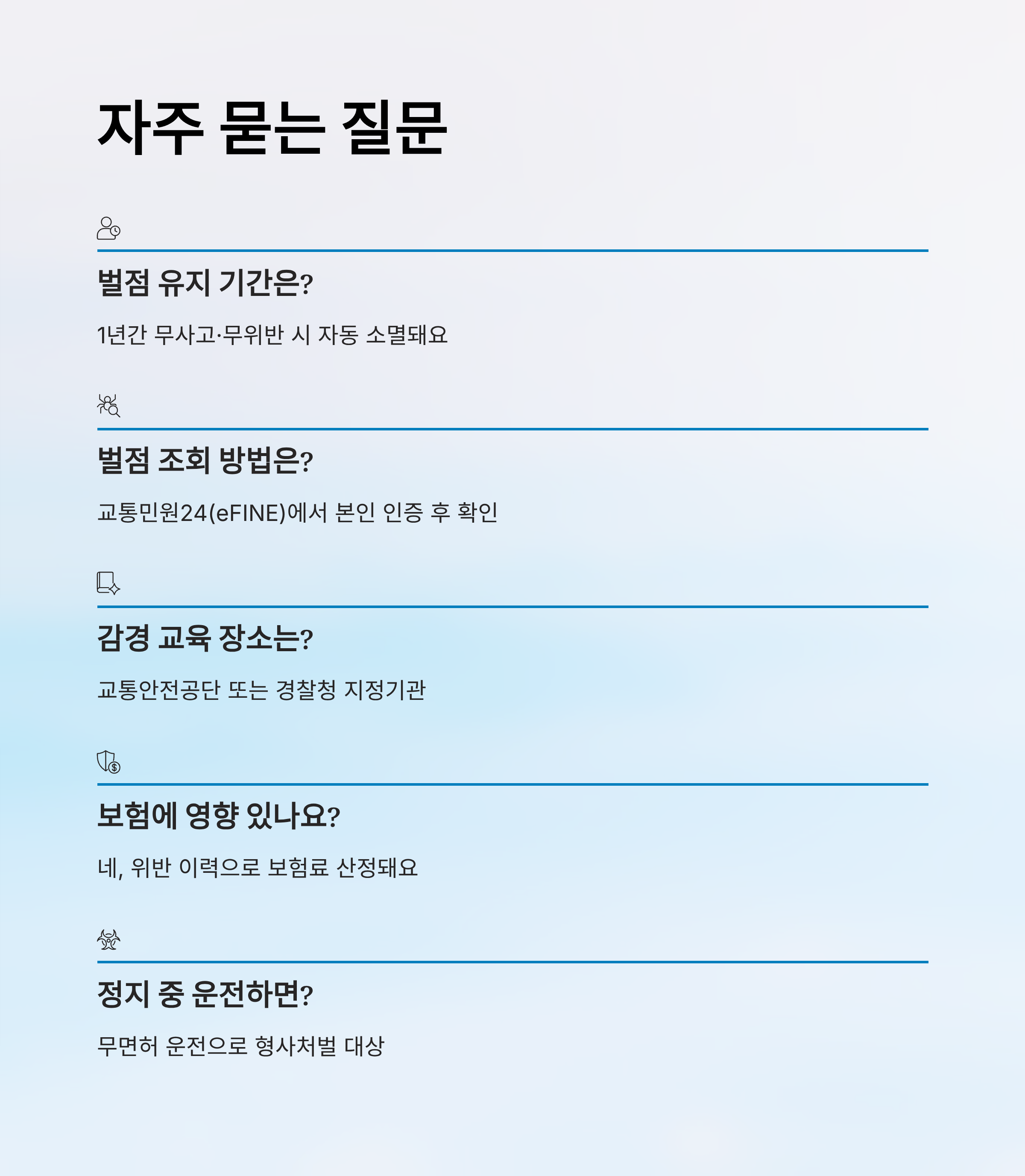 | 무위반·무사고 1년 | 벌점 자동 소멸 | 시점 기준 재계산 |