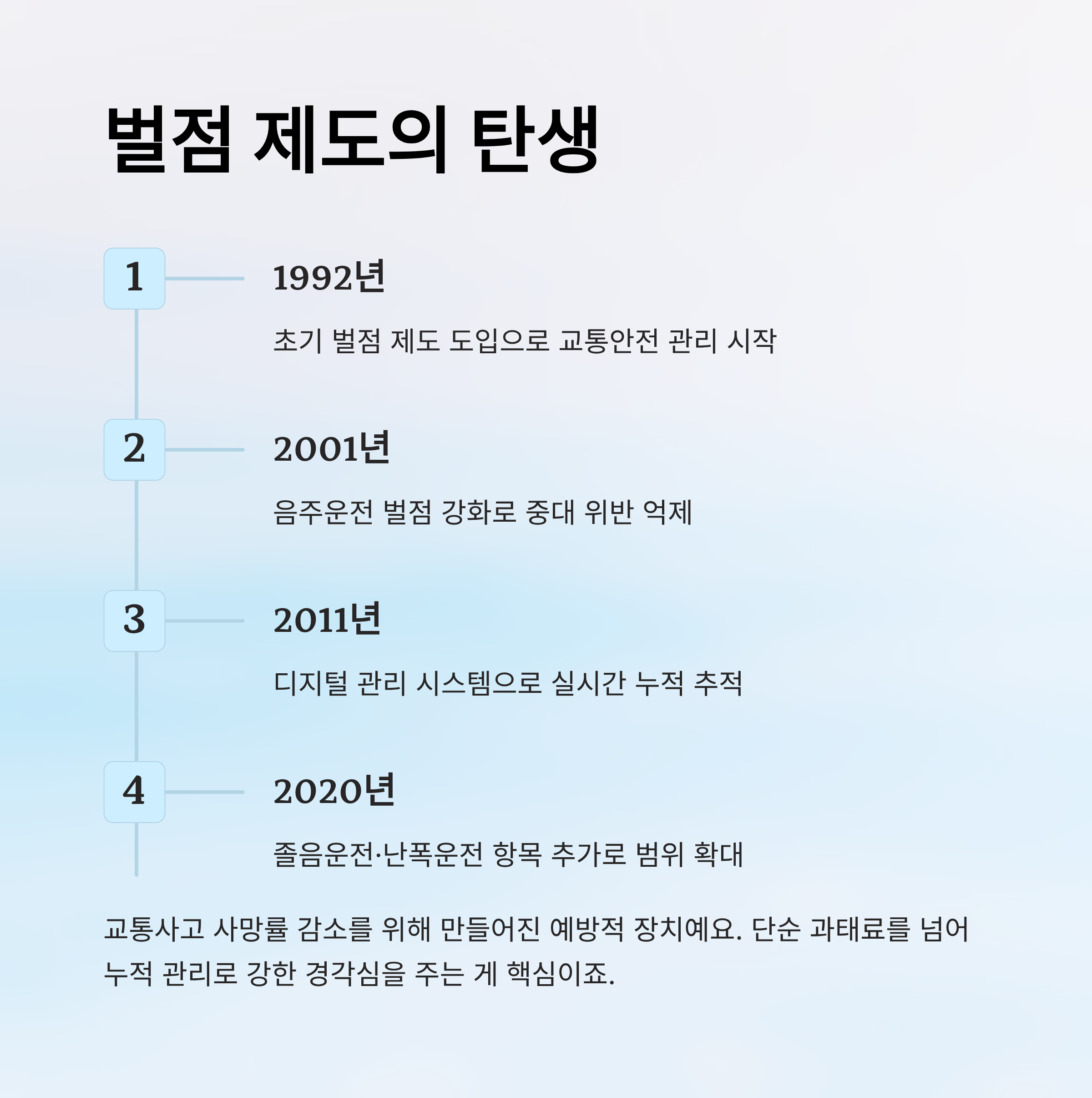 벌점은 일종의 경고예요. 단순 과태료만으로는 교통 법규 위반을 막기 어려웠기 때문에, 누적되면 면허 정지나 취소로 이어지게 만들어 강한 경각심을 주려는 목적이 있었어요.