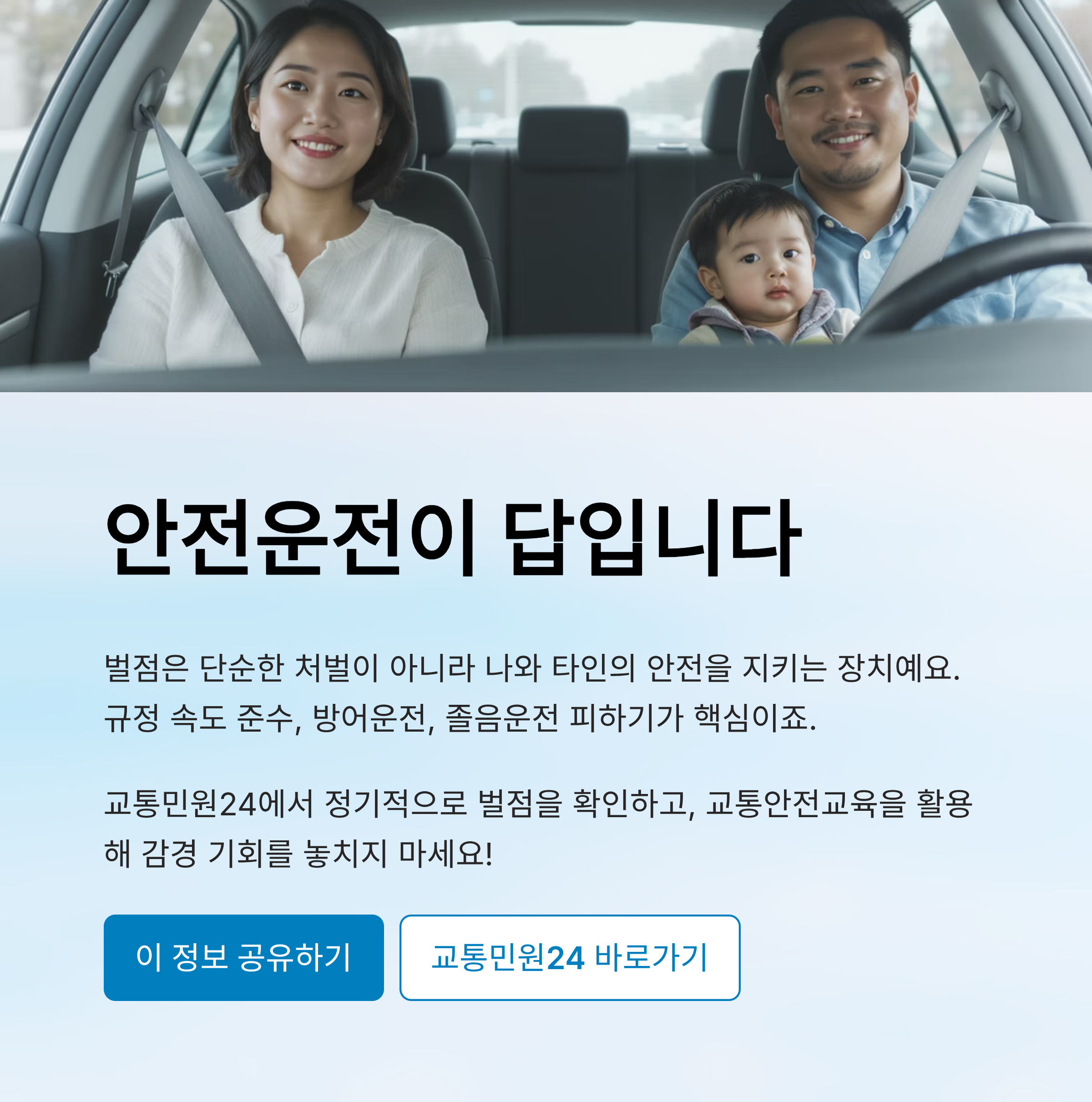 교통법규를 지킨다는 건 단지 벌점을 피하기 위함이 아니라, 내 가족과 타인의 안전을 지키는 일이기도 해요. 💡