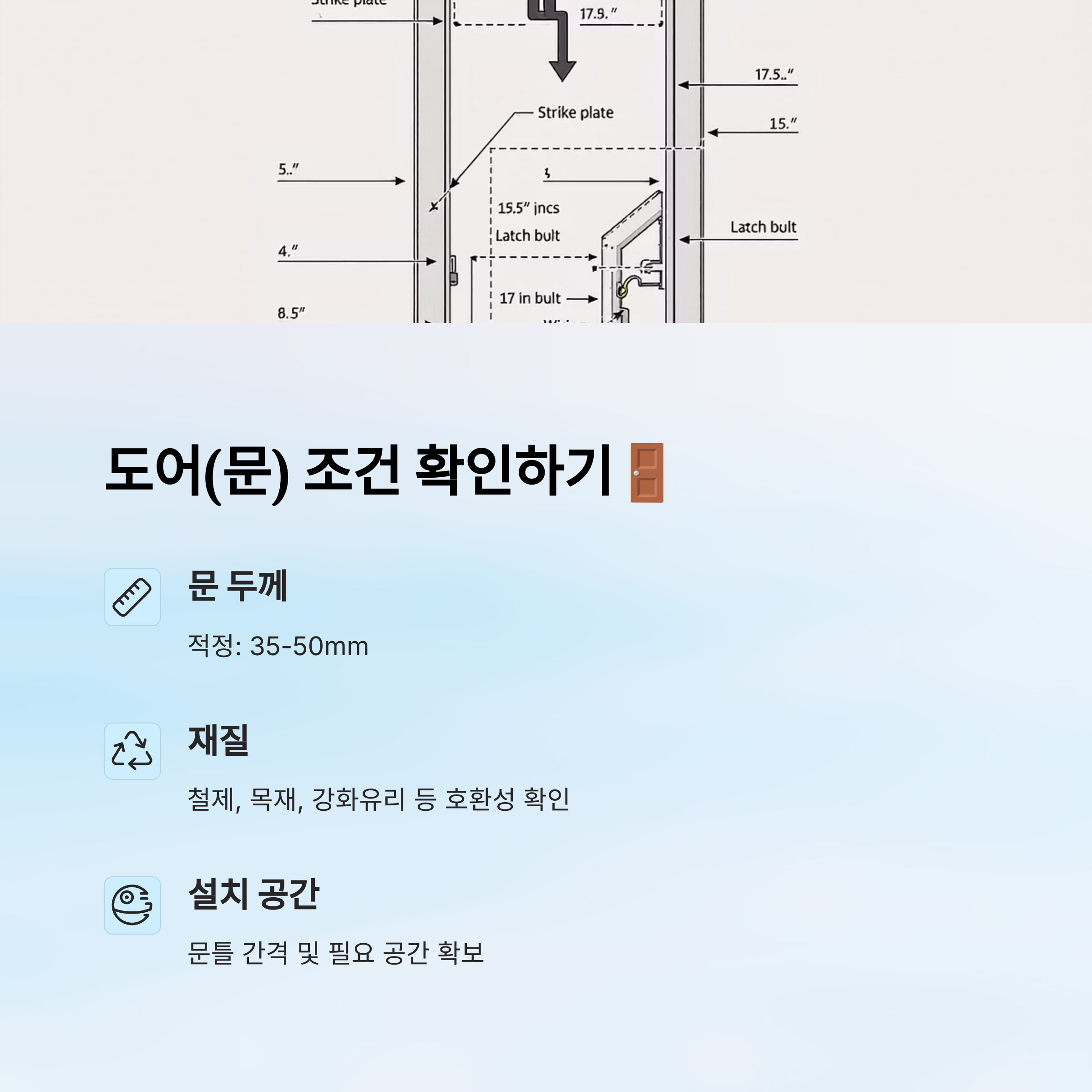 문 두께는 보통 35mm~60mm 사이여야 해요. 이보다 얇으면 본체가 제대로 고정되지 않을 수 있고, 너무 두꺼우면 나사 길이나 잠금장치 위치가 맞지 않아 설치가 어려워요. 또한 문 틀과 도어의 간격(틈새)도 중요한 요소예요. 제품 설명에 있는 권장 간격을 꼭 확인해봐야 해요.