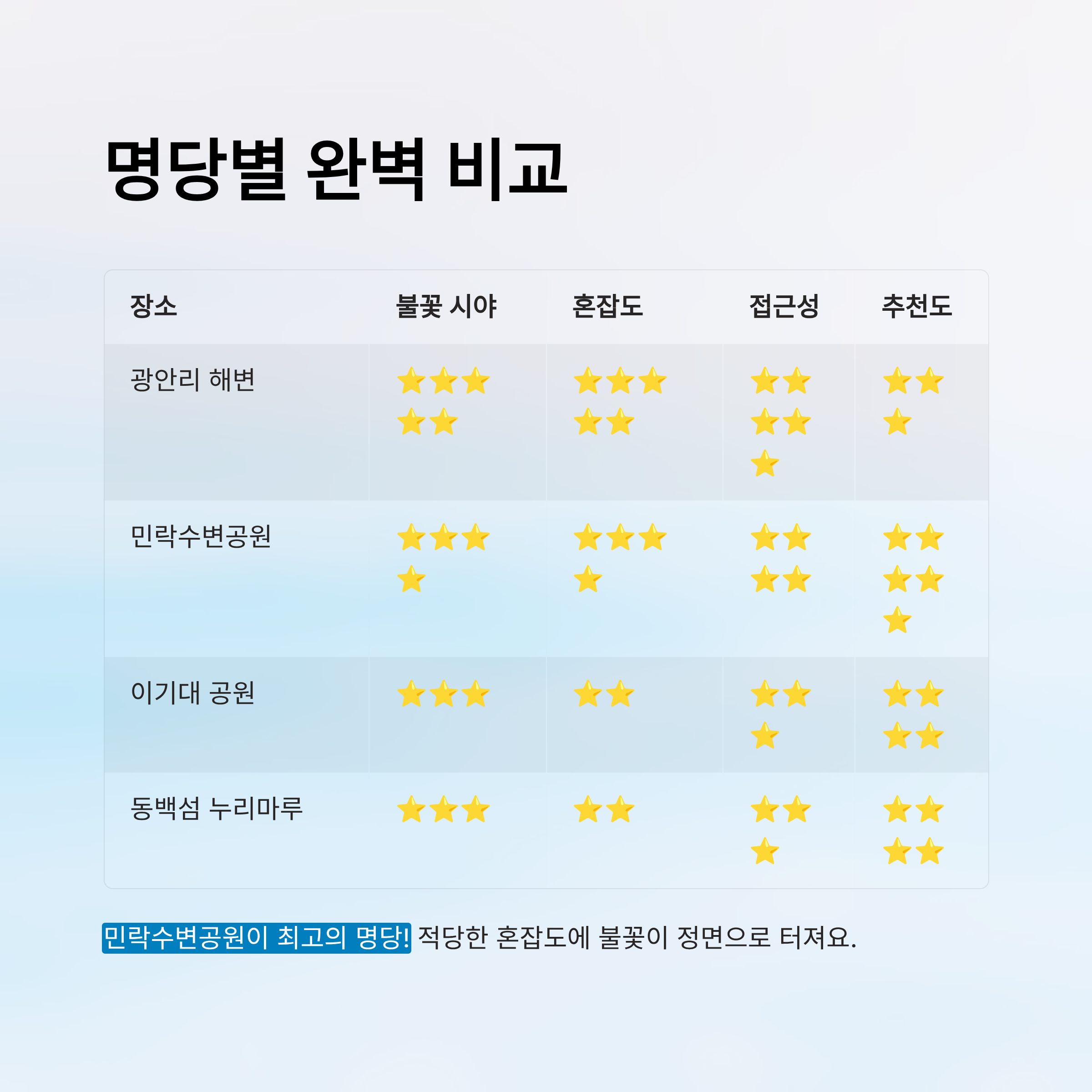 장소 | 불꽃 시야 | 인파 혼잡도 | 접근성 | 추천도 |