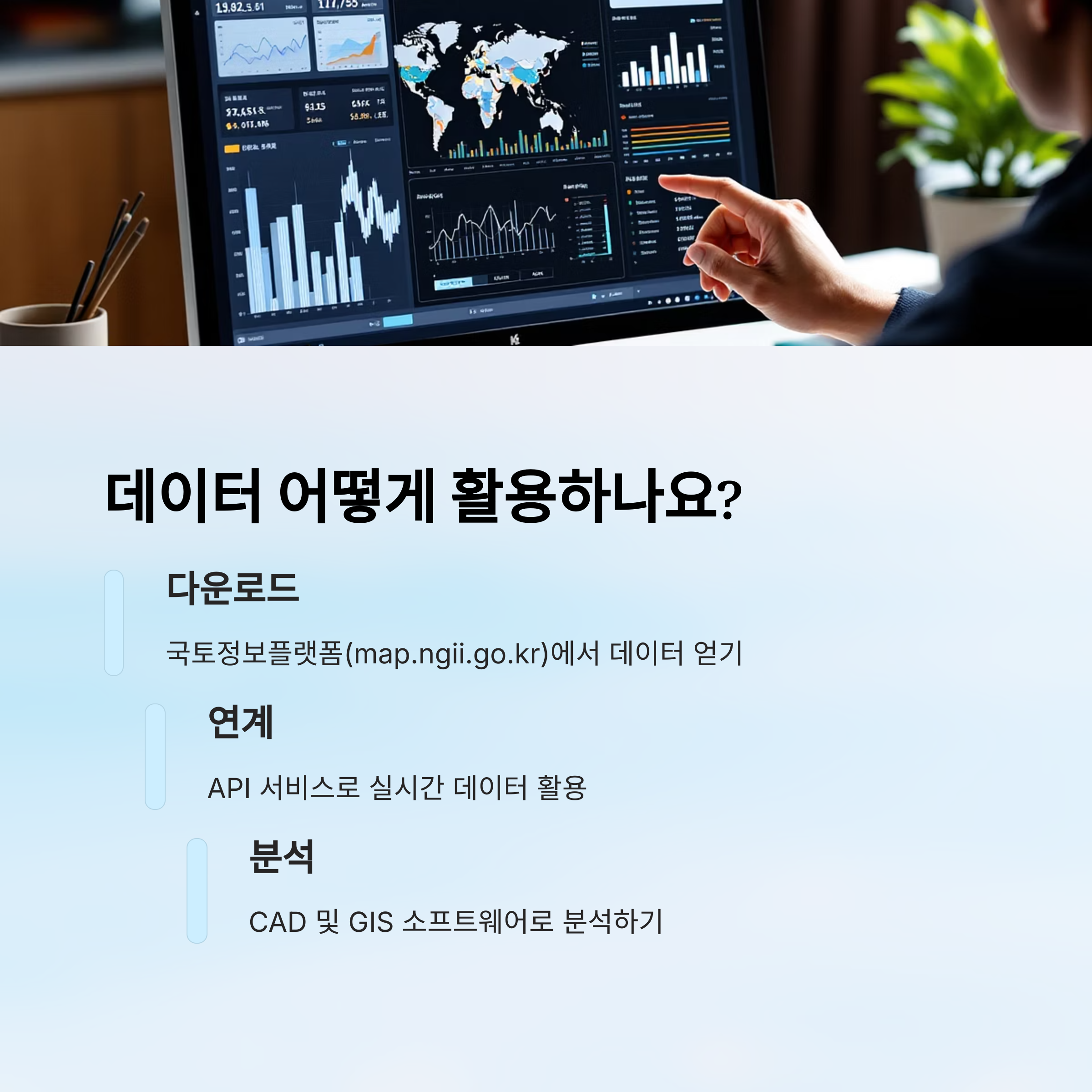 국토지리정보원은 공간정보를 수집하고 가공해서 누구나 활용할 수 있도록 공개하고 있어요. 지도 위에 펼쳐진 이 데이터들은 부동산 가치를 분석하고 미래를 예측하는 데 아주 큰 도움이 되죠.