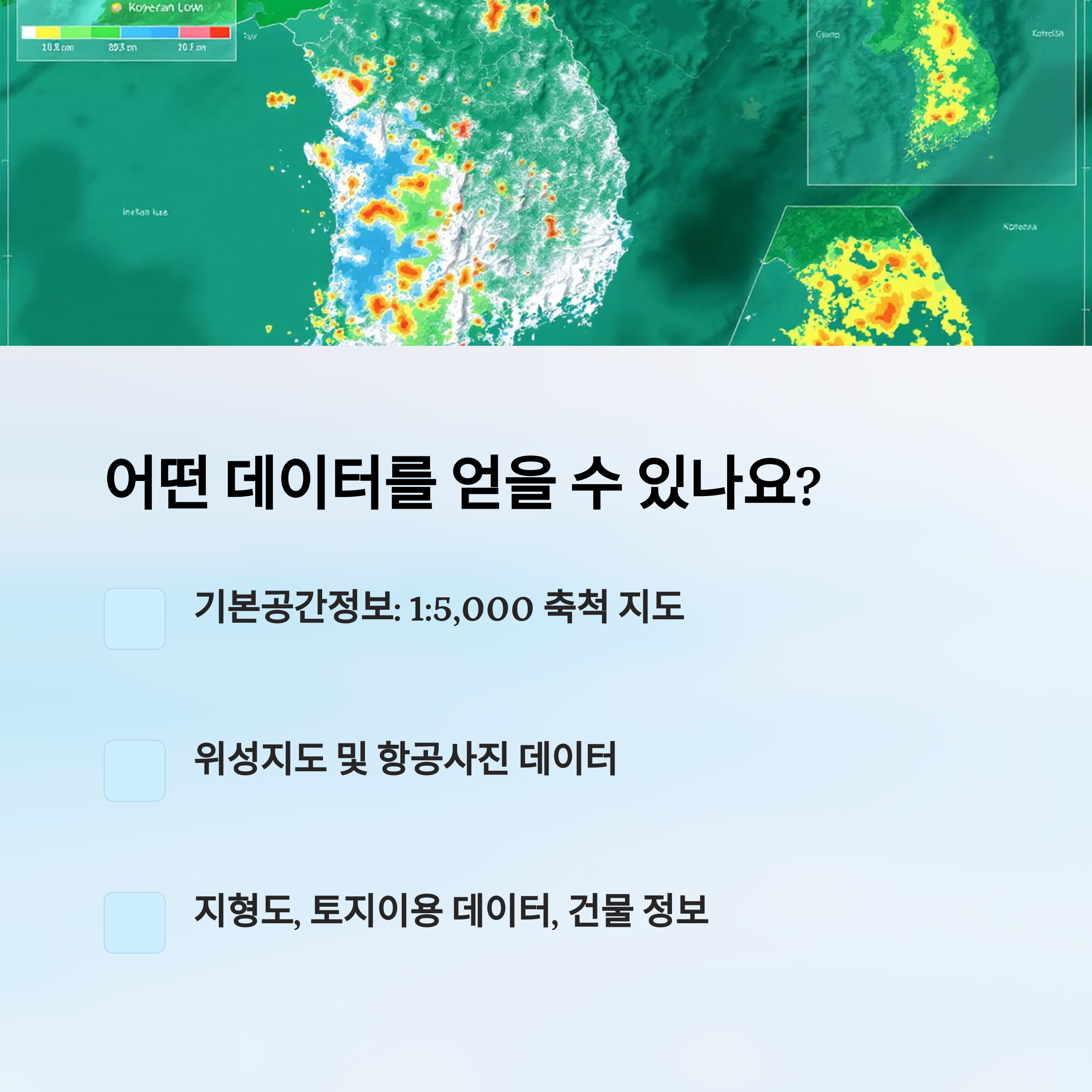 기본적으로는 ‘수치지도’, ‘정사영상’, ‘3차원 공간정보’, ‘건물 및 토지경계 데이터’가 가장 많이 쓰여요. 특히 정사영상은 항공사진을 왜곡 없이 지도화한 이미지라 부동산 현황 파악에 딱이에요.