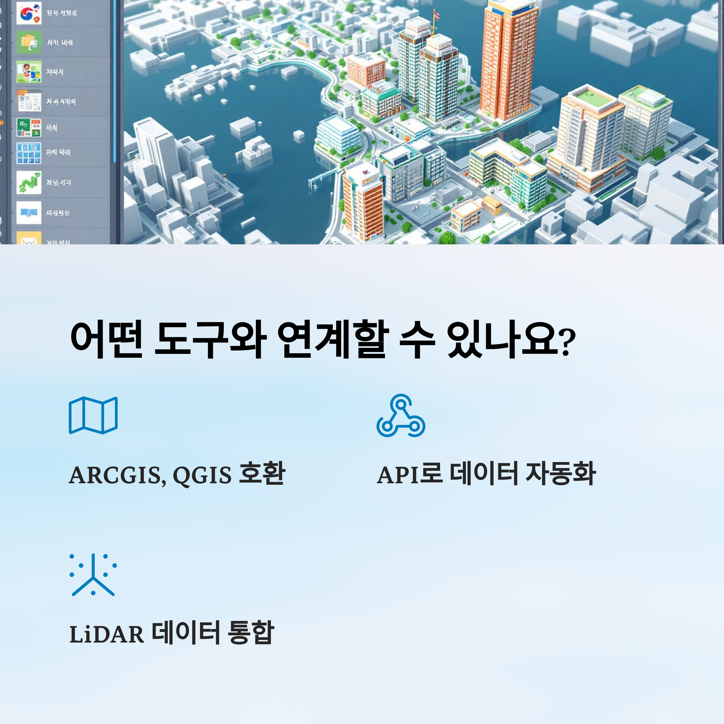 | 공간정보 구축 | 건물, 토지, 행정구역, 도로 등 위치정보 DB화 |