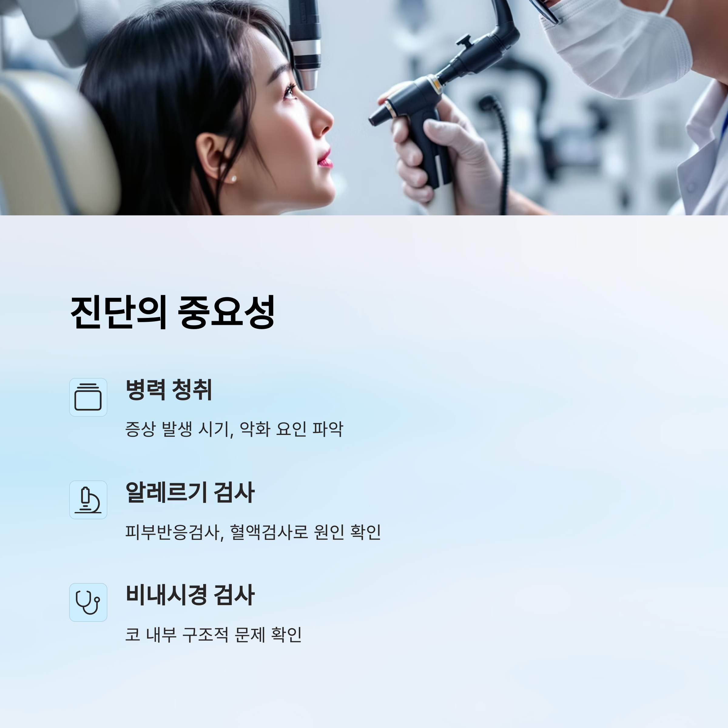 병원에서는 비강 내시경, 알레르기 피부 반응 검사, 혈액 검사 등을 통해 비염의 유형과 원인을 구체적으로 파악해요.