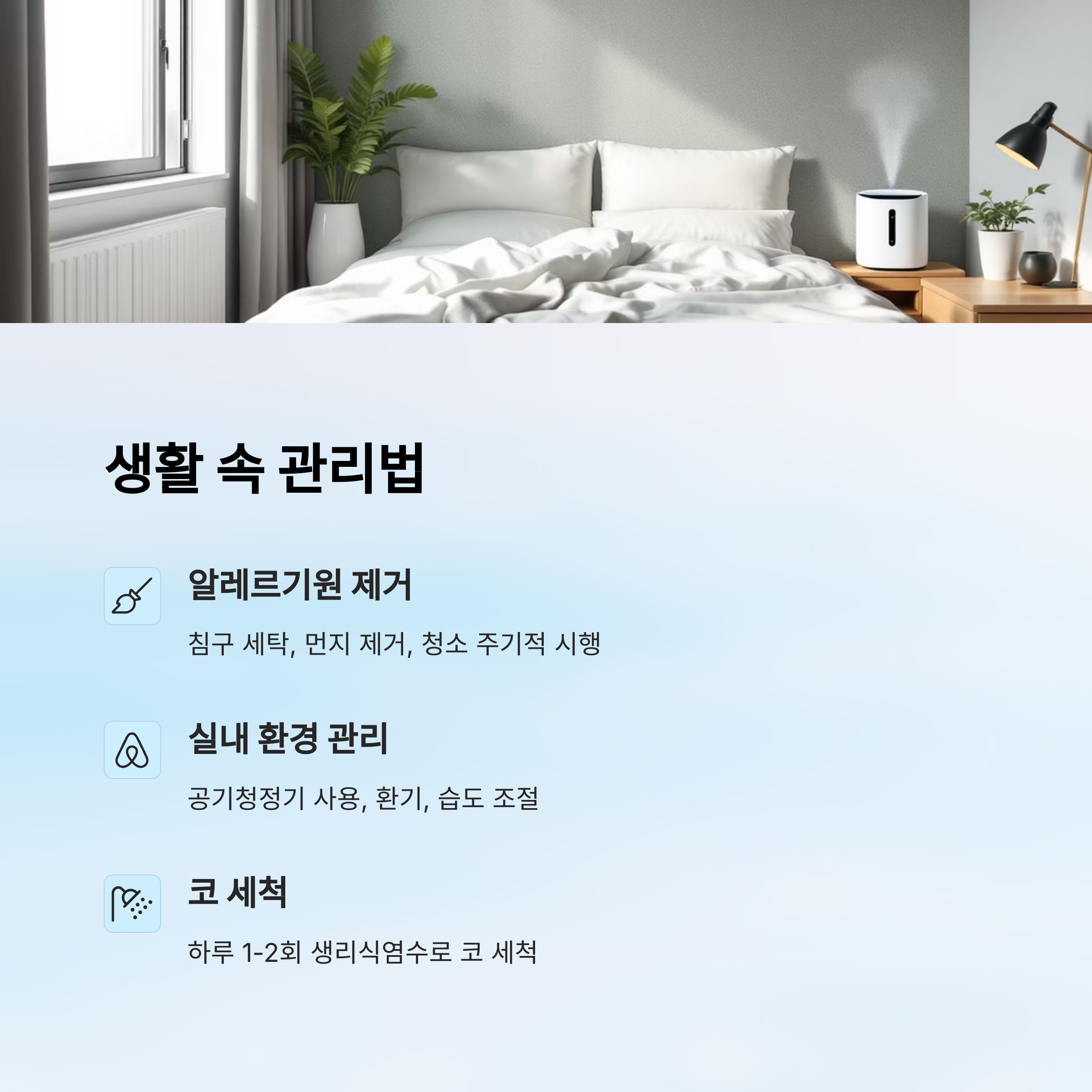 A8. 코세척 + 습도 조절 + 항히스타민 복용을 병행하는 게 가장 효과적이에요.