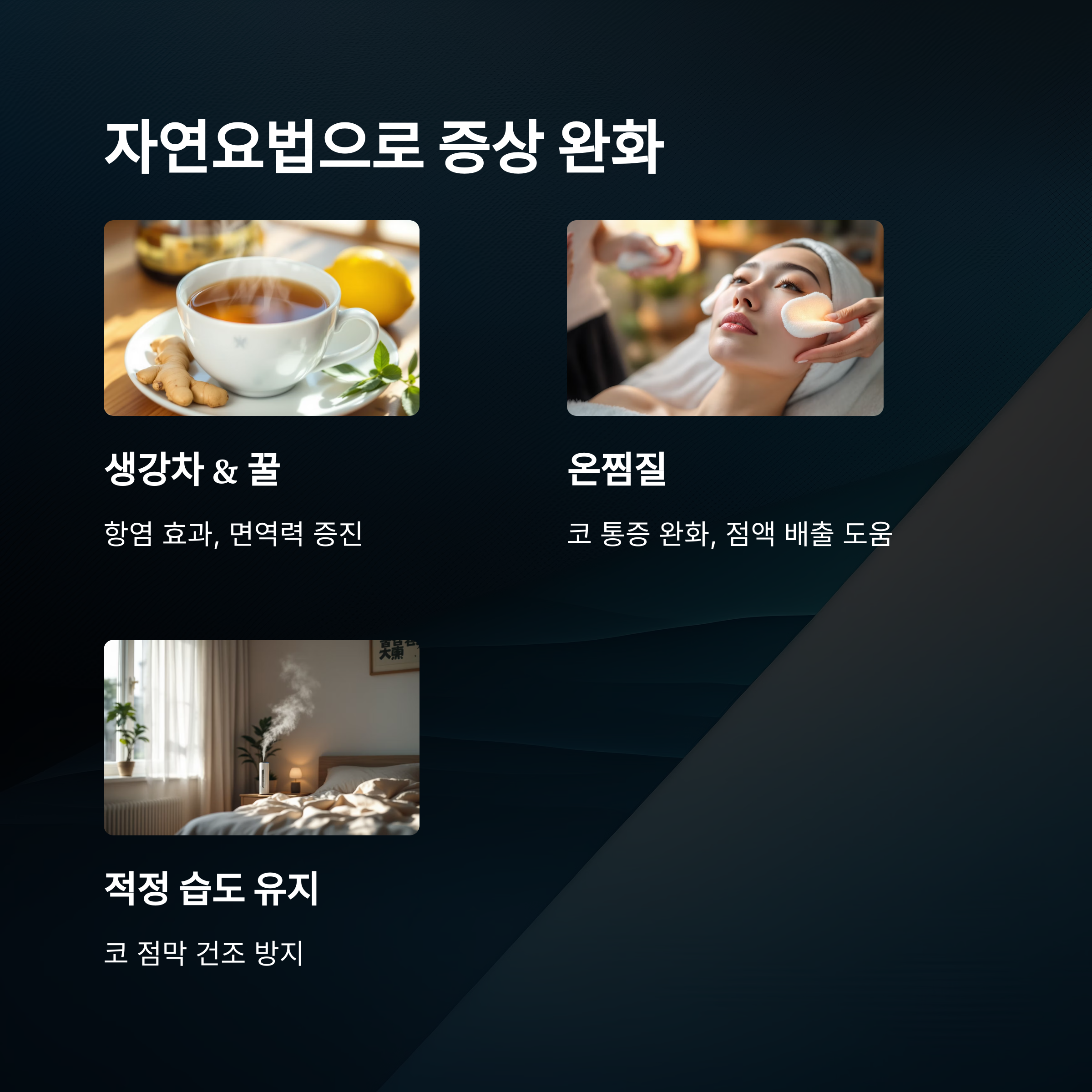 먼저 실내 습도는 항상 40~60%로 유지해주는 게 좋아요. 건조하면 점막이 자극받아 증상이 심해지거든요.