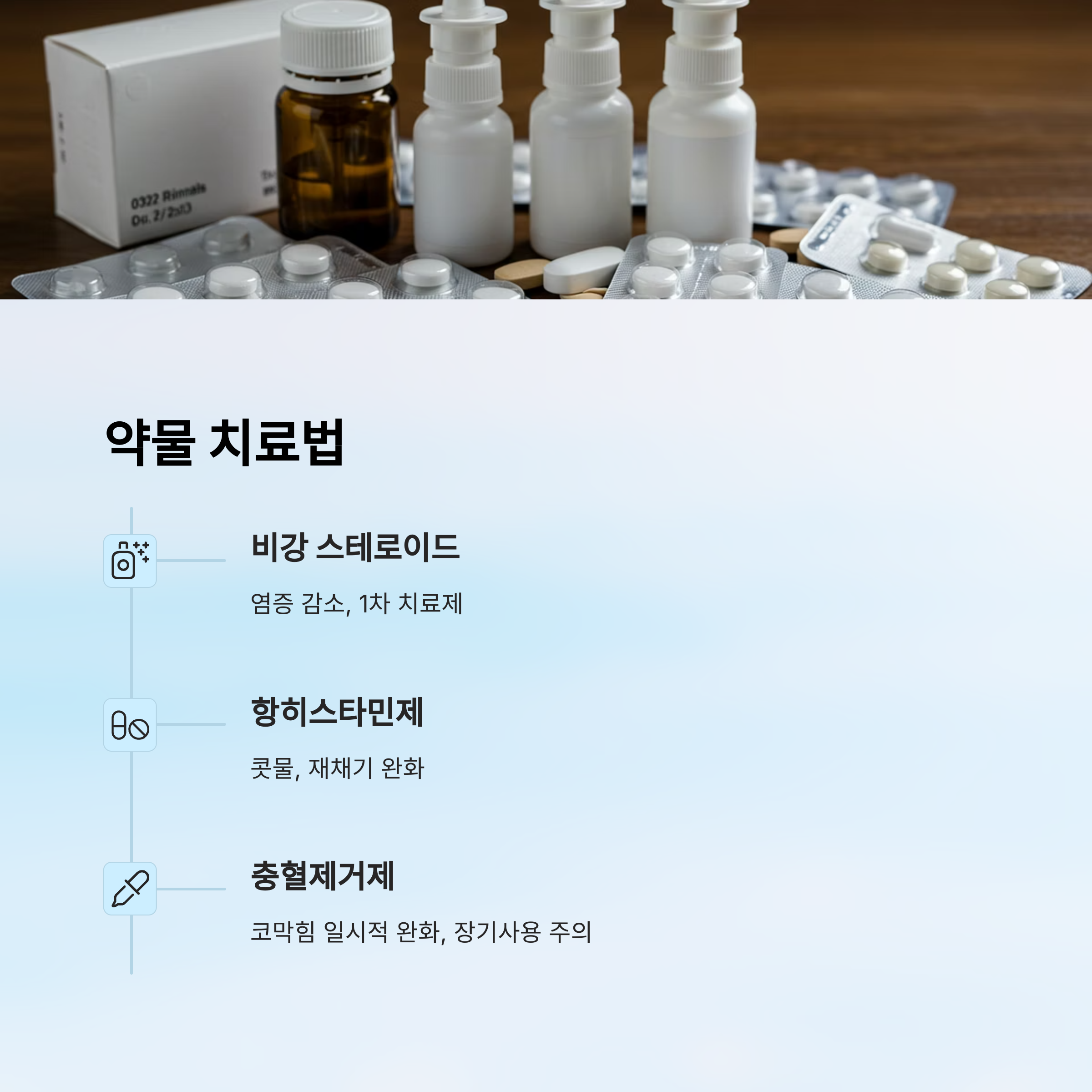 비염 약물치료는 증상 완화를 목적으로 해요. 일반적으로는 항히스타민제, 비강 스프레이, 스테로이드 제제 등을 사용해요.