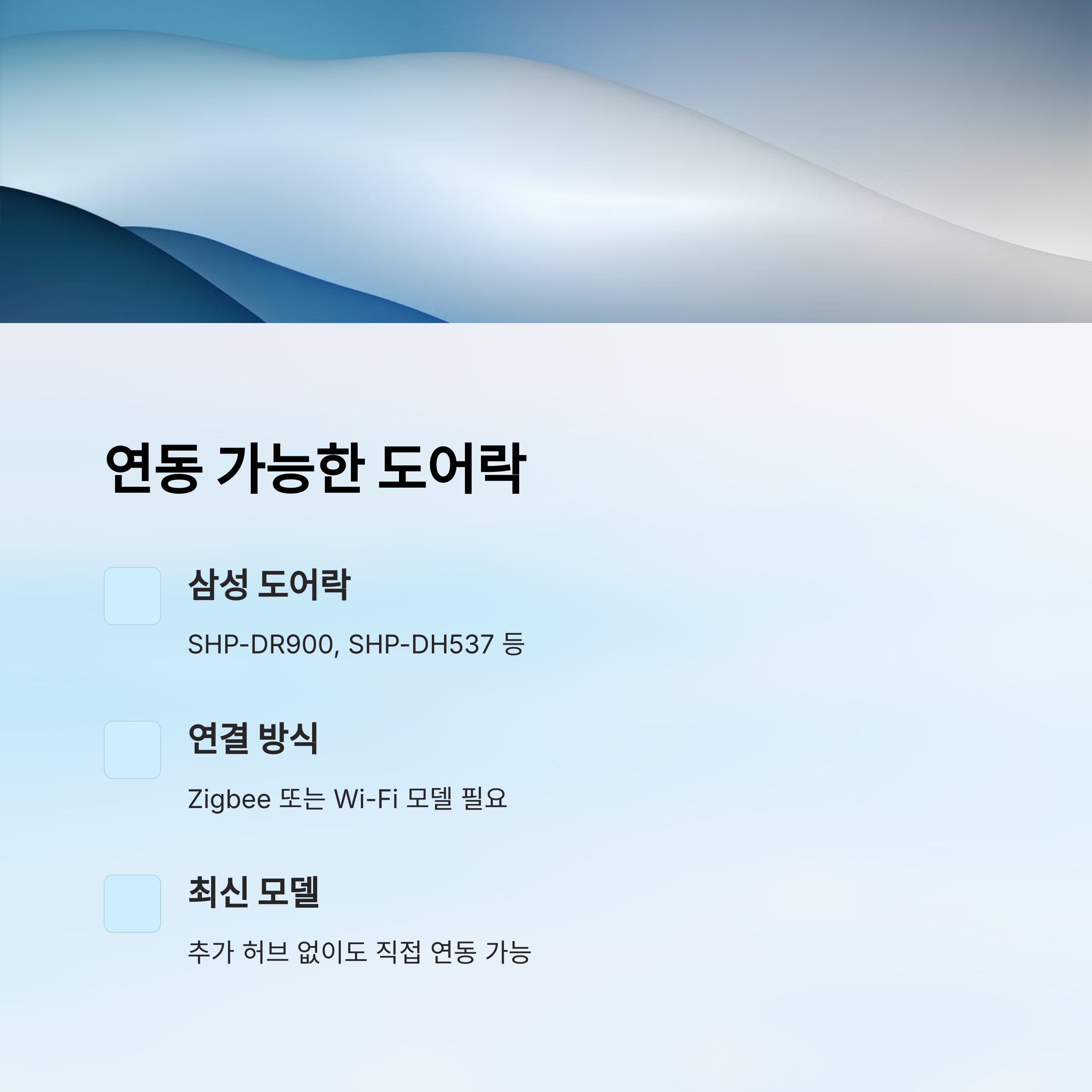 | 삼성 SDS | SHP-DR900, SHP-DP930 등 | Wi-Fi, Zigbee | SmartThings 앱 + 허브 필요 |