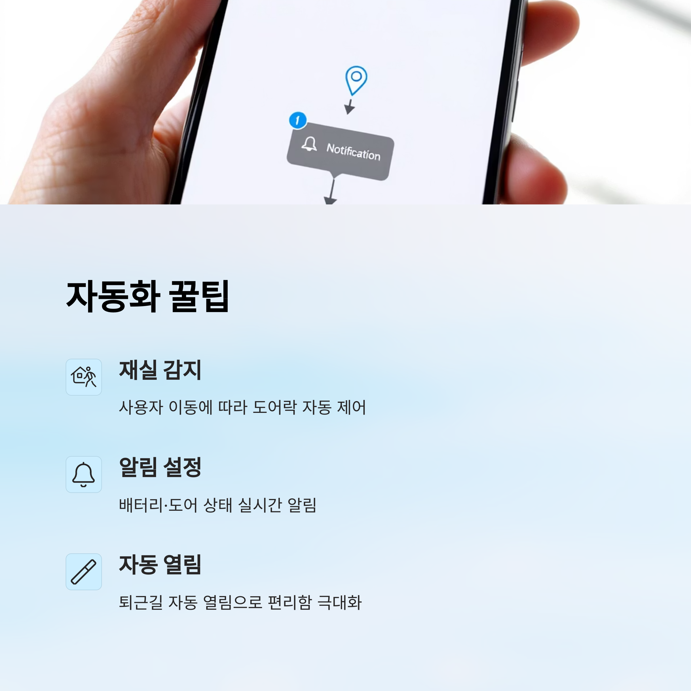 ① 외출 시 도어락 자동 잠금 위치 기반 자동화 설정을 통해, 내가 집을 떠나면 도어락이 자동으로 잠기게 만들 수 있어요. (단, 위치 권한 필수)