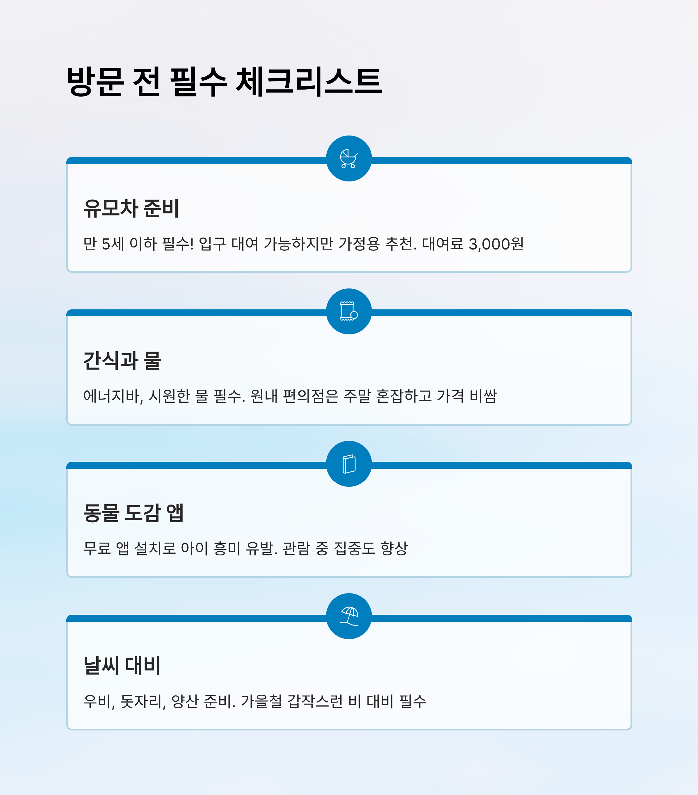 체크리스트를 미리 준비하면 동물원에서의 만족도는 정말 달라져요. 준비물 하나하나가 아이의 컨디션과 즐거움에 직접적으로 연결되니까, 이 표를 참고해서 꼼꼼히 챙겨주세요! 🐘