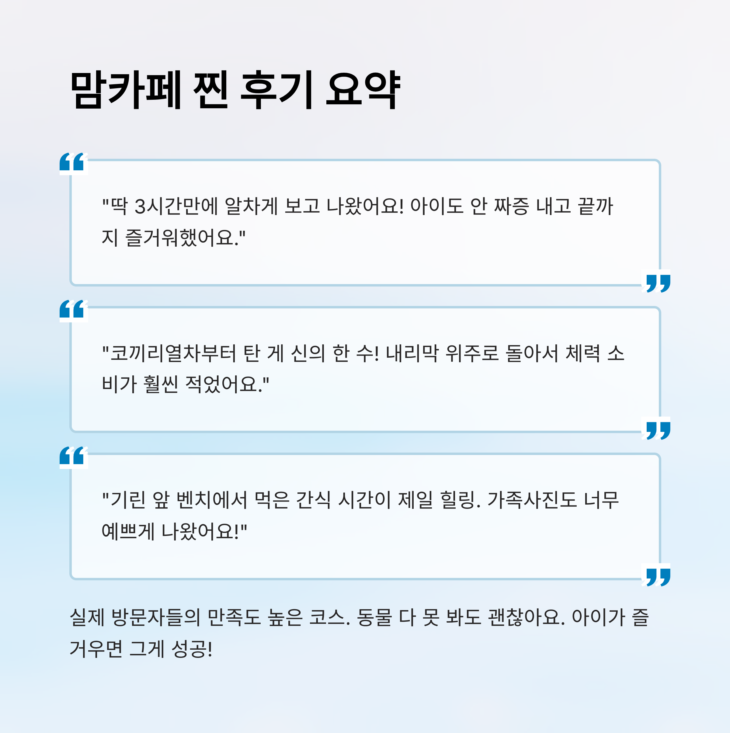 가장 많이 등장하는 후기는 “진짜 딱 3시간만에 알차게 보고 나왔다!”는 거였어요. 특히 유아나 초등 저학년 아이를 데리고 갔을 때, 이 코스를 그대로 따라가면 아이가 지치지 않고 끝까지 즐거워한다는 반응이 많았답니다. 체력 안배도 되고, 동물 집중도도 훨씬 좋았다는 평이 많았어요.