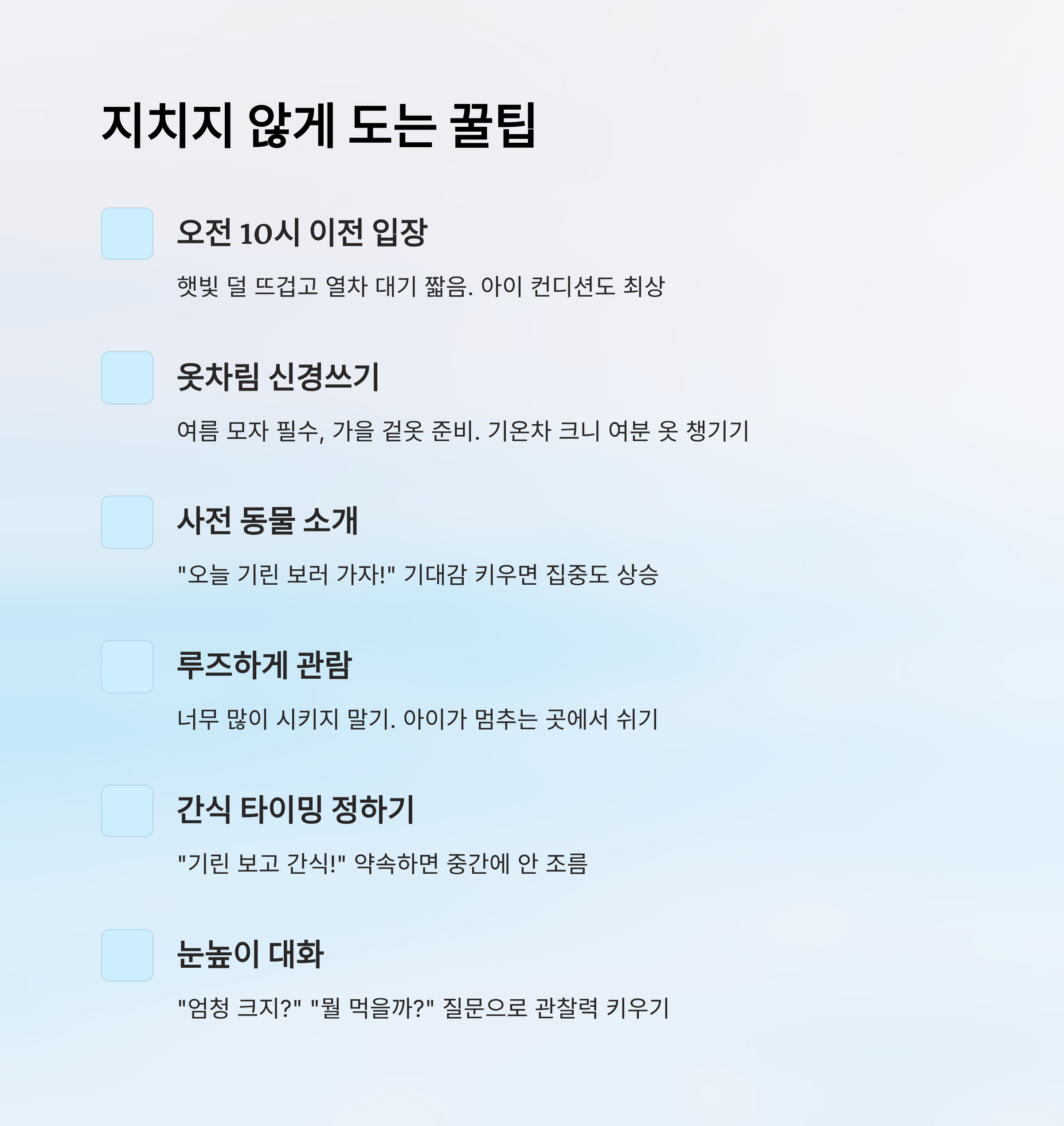 그리고 많은 분들이 공감한 팁은 “동물 다 못 봐도 괜찮다!”는 마인드예요. 아이가 즐겁게 봤다면, 100마리 중 20마리만 봐도 성공이란 거죠. 모든 걸 다 보겠다는 욕심보다는, 아이가 오래 기억할 순간을 만드는 게 훨씬 중요하다는 말에 고개를 끄덕이게 됐어요.