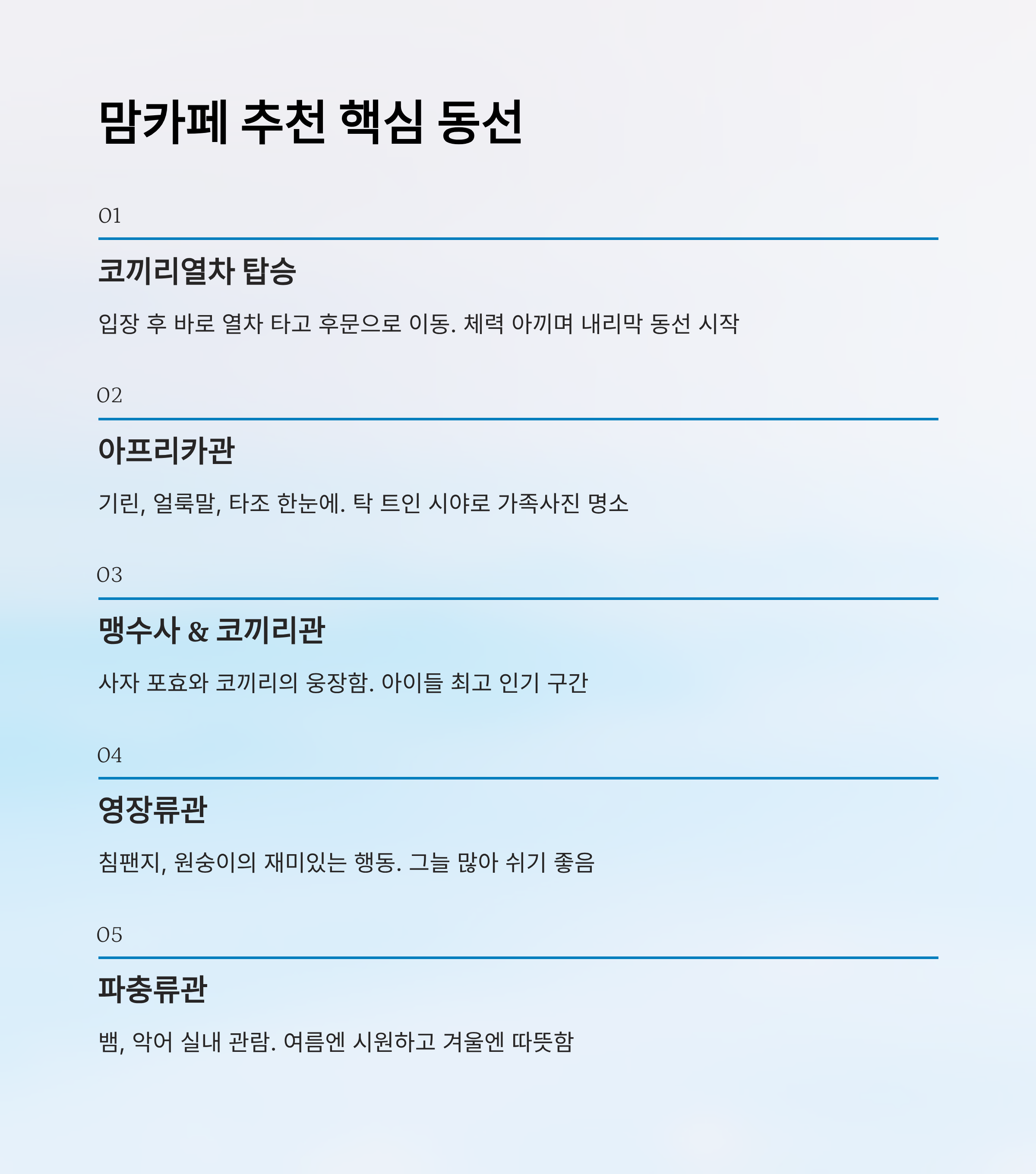 이렇게 돌면 아이가 좋아하는 동물을 빠짐없이 만나면서도, 돌아다니느라 지칠 틈이 없어요. 맘카페 후기에 따르면, 이 코스대로 돌고 나면 “아이도 안 짜증 내고 엄마 아빠도 체력 OK”라는 반응이 정말 많더라고요. 꼭 캡처해서 활용해보세요!