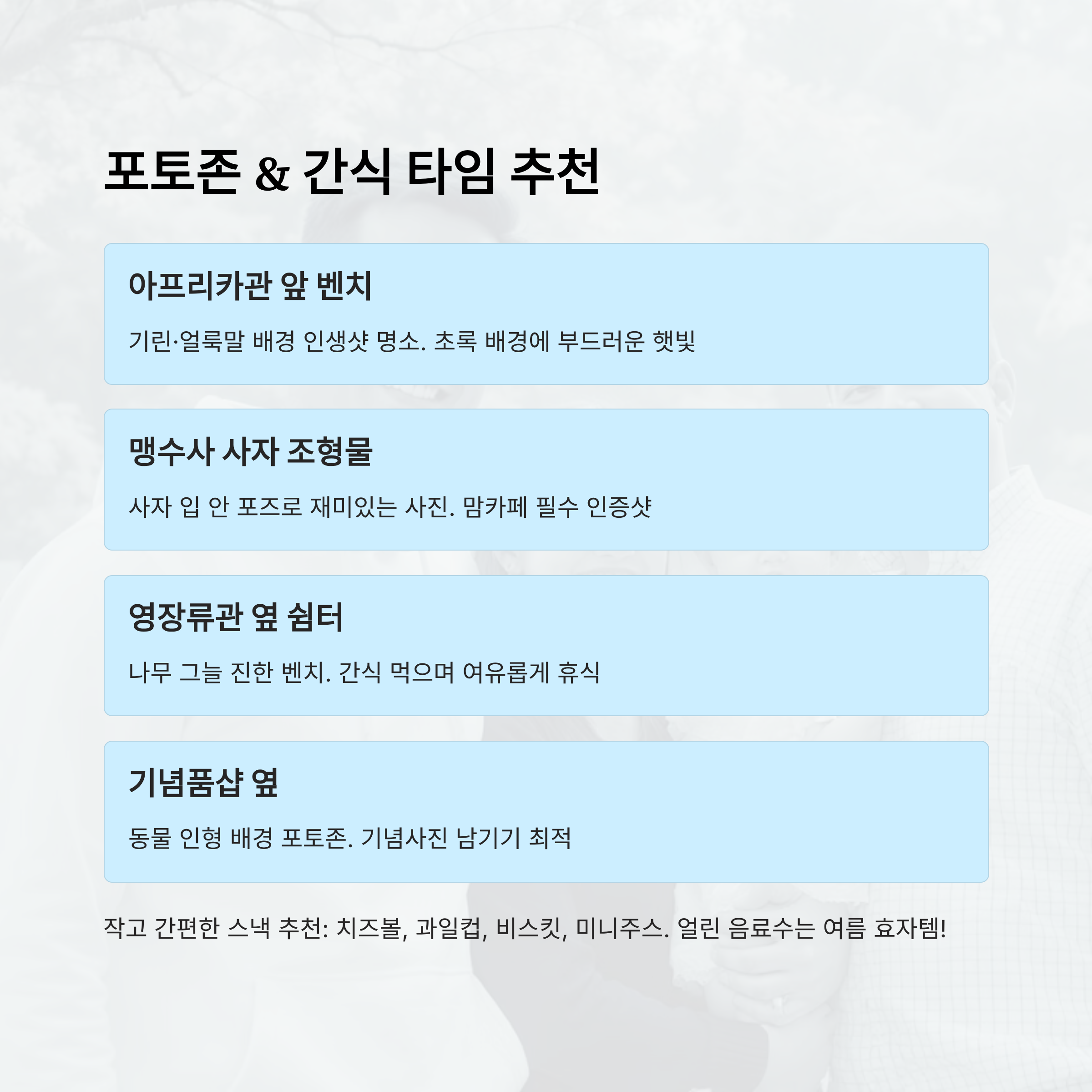 동물원 관람 중간중간, 사진도 남기고 간식도 먹어야 진짜 즐거운 시간이 되잖아요? 아이들도 동물만 보고 다니면 금세 지치기 때문에, 중간중간 쉬는 구간을 넣는 게 아주 중요해요. 여기에 소개하는 구간은 맘카페에서 실제로 “사진 잘 나오는 곳”과 “앉아서 쉬기 좋은 포인트”로 입소문 난 장소들이에요!