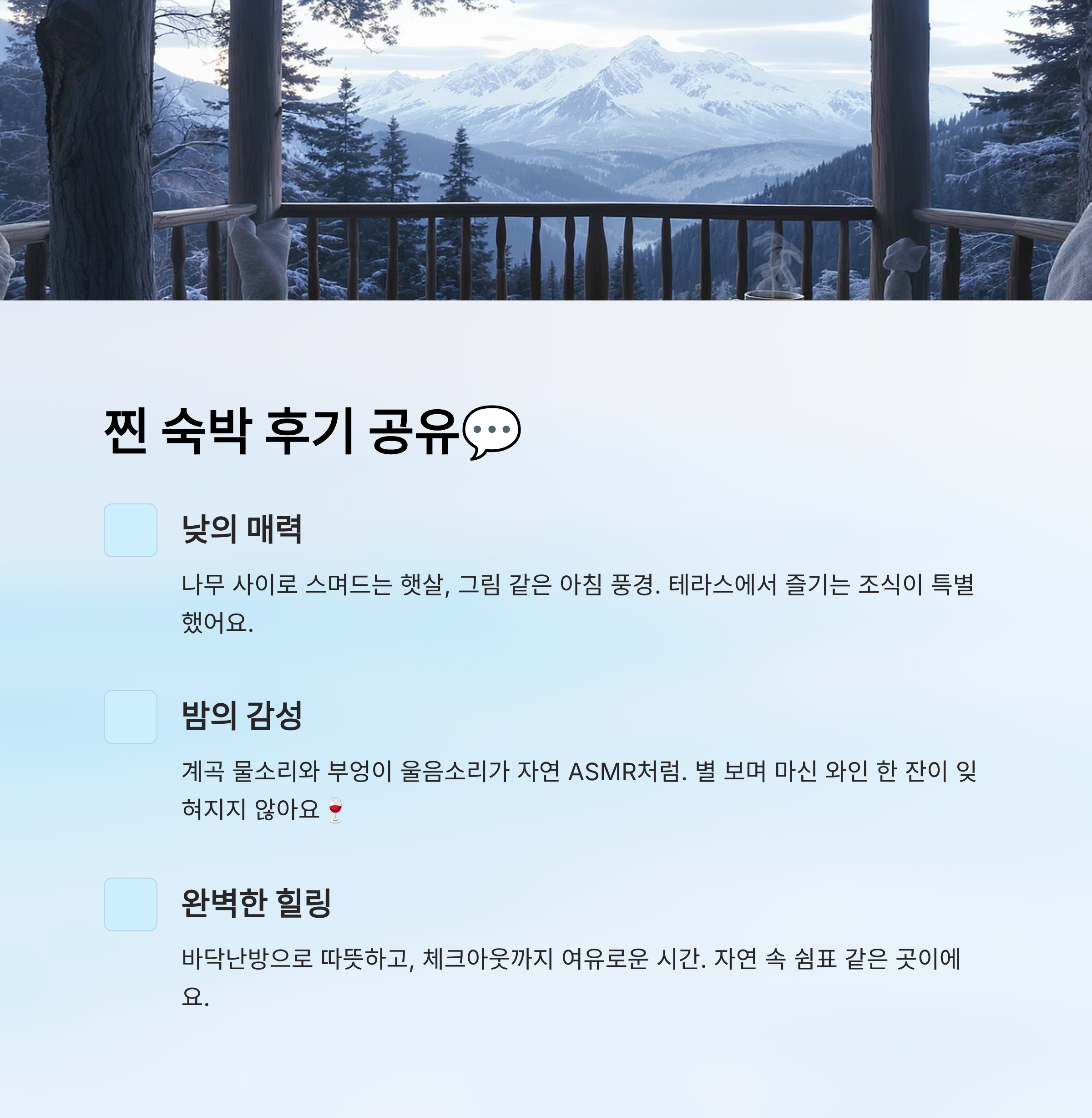 6️⃣ **겨울 시즌은 의외의 꿀템**: 여름보다는 겨울 시즌에 예약 경쟁률이 낮고, 나무들이 앙상해지면서 오히려 뷰가 트여 더 멋진 경치를 감상할 수 있어요. 난방도 잘 되어 있어서 추위 걱정 없어요❄️