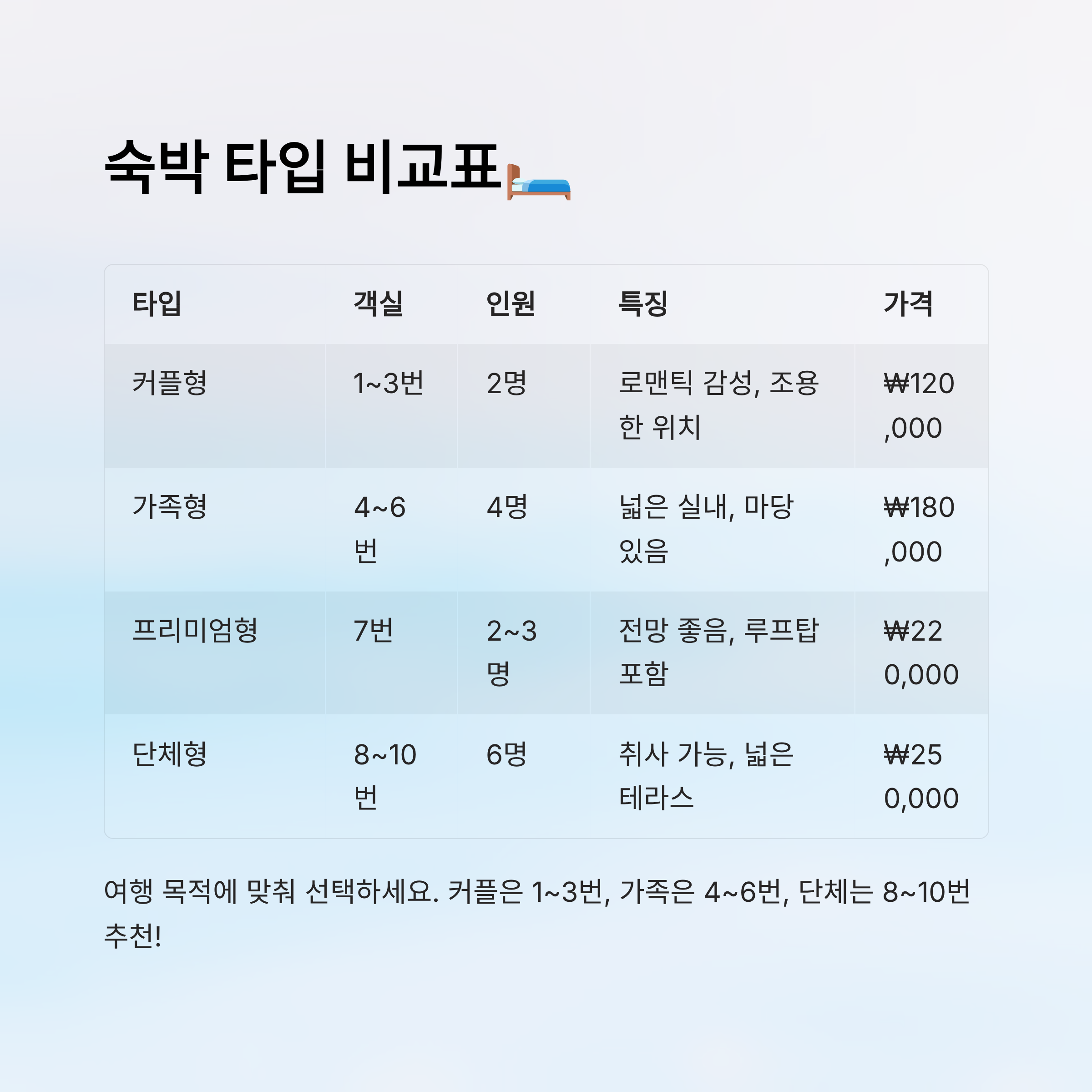 | 프리미엄형 | 7번 | 2~3명 | 전망 좋음, 루프탑 포함 | ₩220,000 |