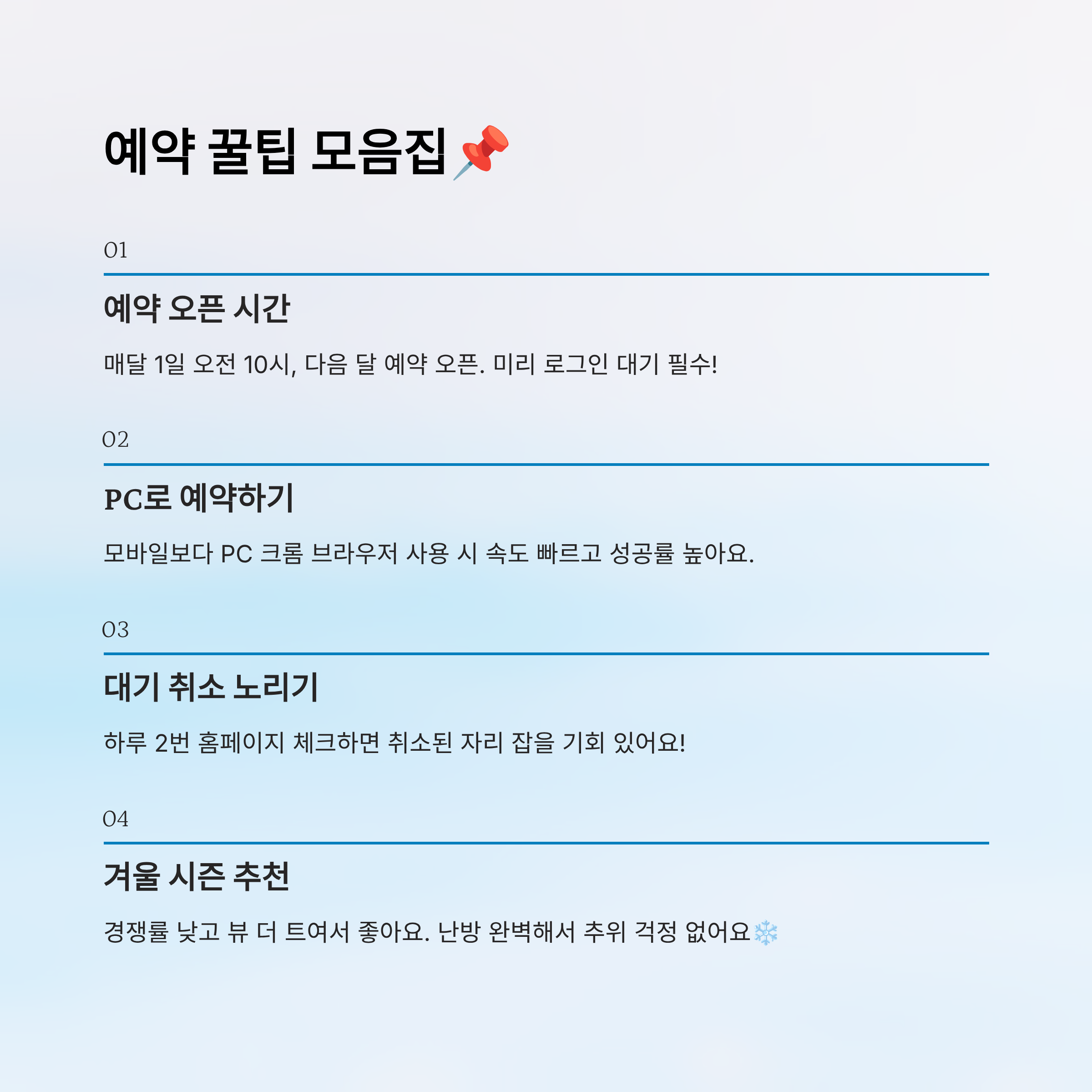 1️⃣ **예약 오픈 시간 체크**: 수락휴 공식 홈페이지는 매달 1일 오전 10시에 다음 달 예약이 열려요. 이 시간 전에 로그인 상태로 대기해두는 게 핵심이에요!