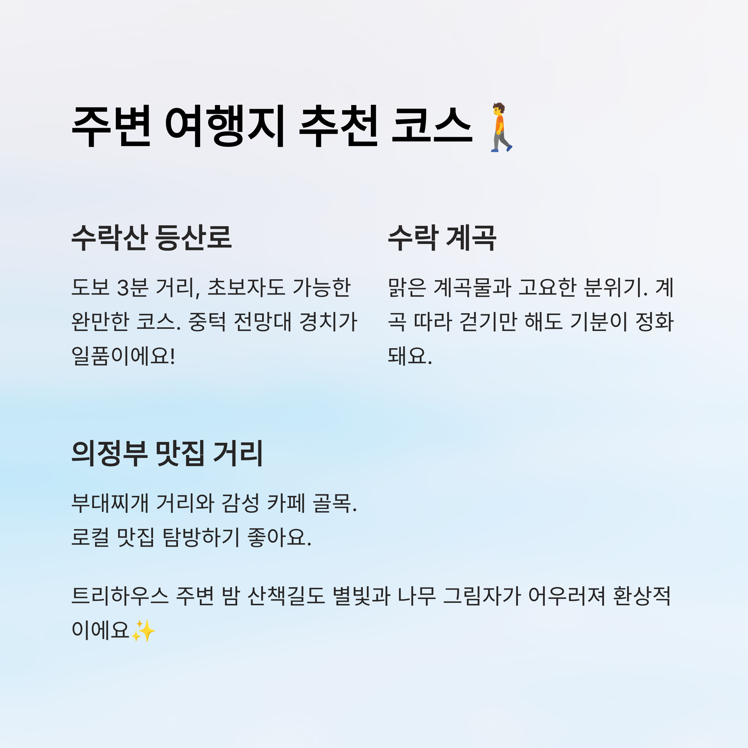📍 **수락산 등산로 (도보 3분 거리)** 트리하우스 바로 옆에서 수락산 등산로가 시작돼요. 등산 초보자도 무난하게 오를 수 있는 코스라 아침에 상쾌한 공기 마시며 산책하기 딱 좋아요. 중턱 전망대에서 보는 경치는 그냥 감탄 나와요!