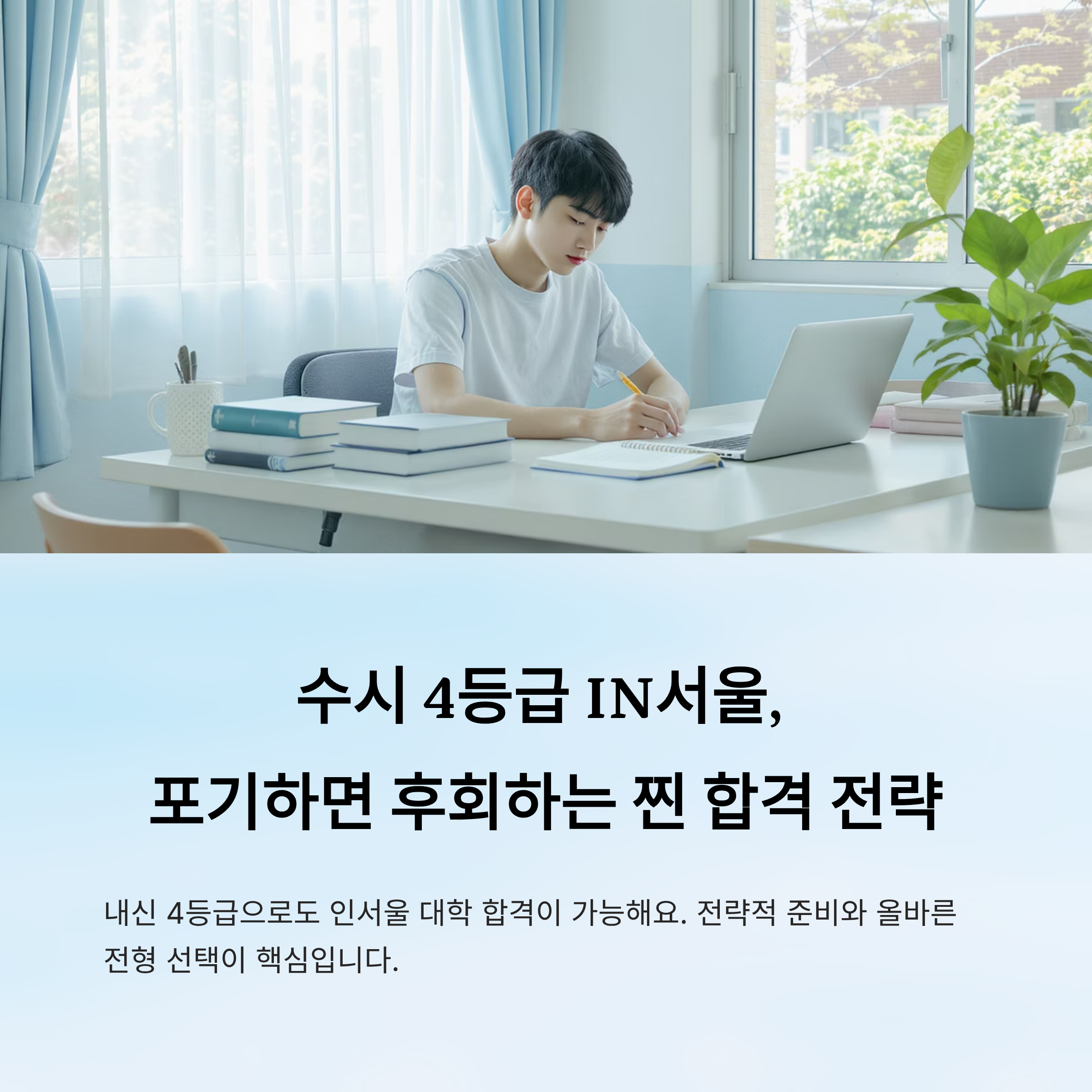 많은 학생들이 ‘내신 4등급으로는 인서울 대학은 힘들다’라고 생각해요. 하지만 이건 절대적인 진실이 아니에요. 실제로 4등급대 학생이 전략적으로 준비해서 서울에 있는 대학에 합격한 사례는 매년 존재해요. 중요한 건 지원 전략과 준비 방향을 얼마나 똑똑하게 잡느냐예요.