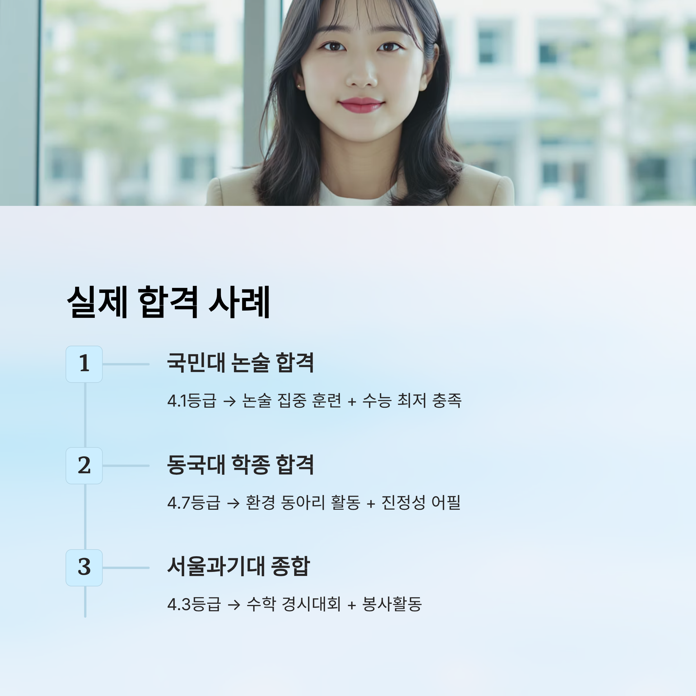 수험생들에게 가장 큰 힘이 되는 건 바로 실제 합격 사례예요. 내신 4등급 학생이 어떻게 인서울 대학에 입학했는지 구체적인 이야기를 듣는 순간, ‘나도 할 수 있다’라는 자신감을 얻을 수 있죠. 여기서는 몇 가지 대표적인 성공 스토리를 소개해 드릴게요.