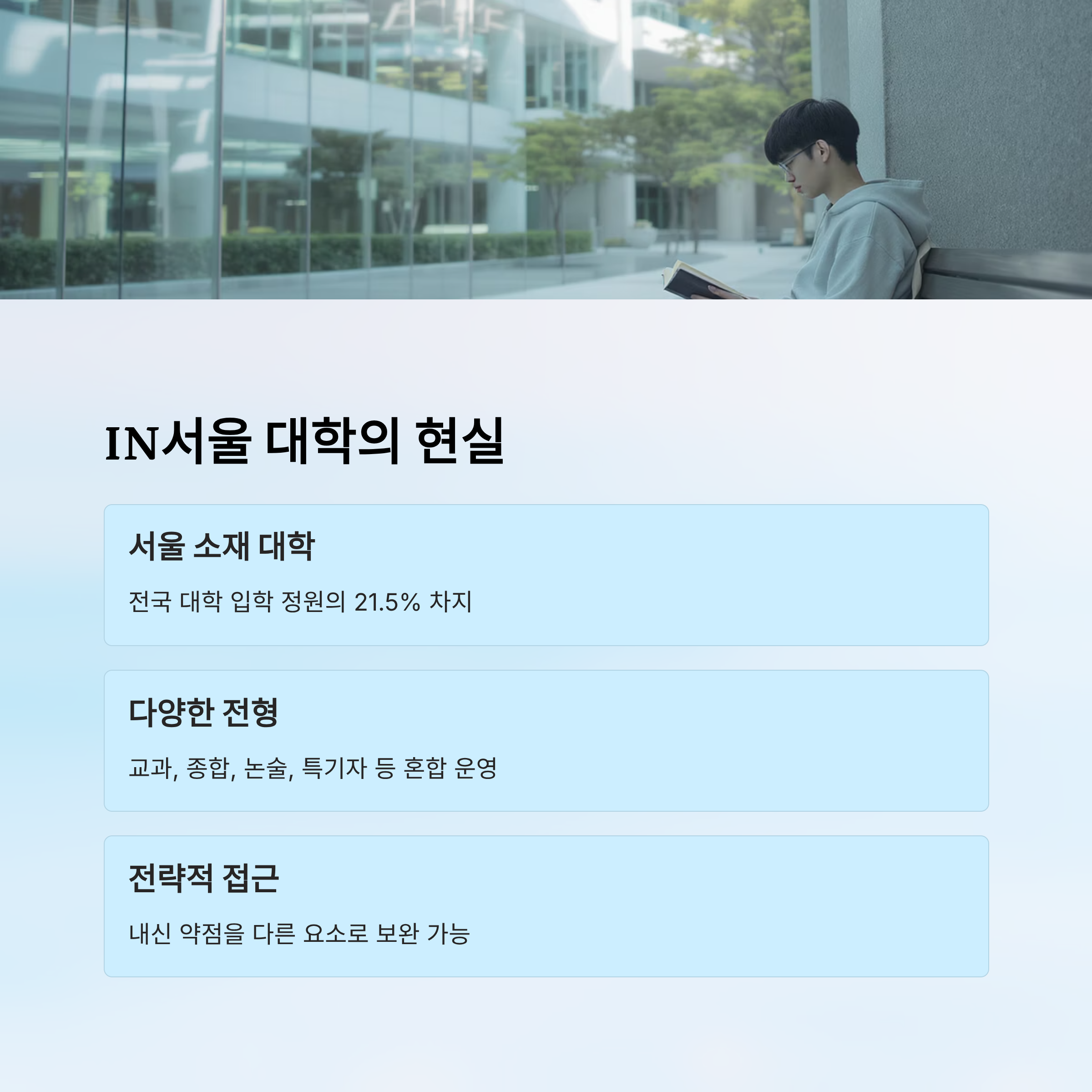 실제로 인서울 대학이라고 해도 전형 방식은 다양해요. 정시에서는 수능 성적이 주를 이루지만, 수시에서는 학생부 교과, 학생부 종합, 논술 전형, 특기자 전형 등이 혼합돼 있어요. 이 때문에 내신이 낮아도 다른 요소로 보완하면 충분히 경쟁력을 가질 수 있다는 점이 중요해요.