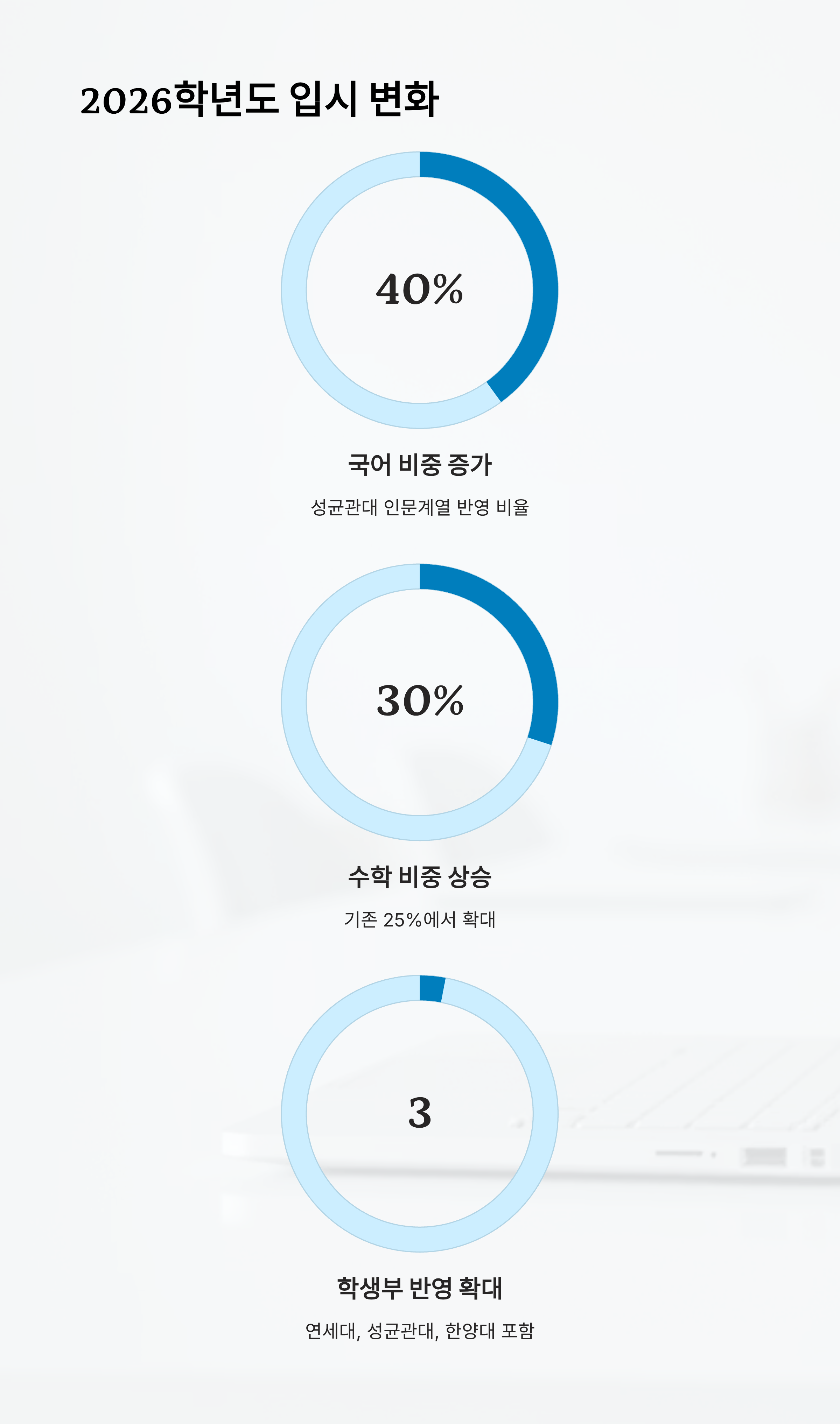 먼저 학생부 반영 확대예요. 기존에는 서울대와 고려대만 정시에서 학생부를 반영했지만, 2026학년도부터는 연세대, 한양대, 성균관대 일부 단과대학에서도 학생부가 반영돼요. 이 말은 수능 성적만 잘 받아도 합격 가능했던 구조가 달라지고, 내신과 비교과 관리가 함께 필요해졌다는 뜻이에요.