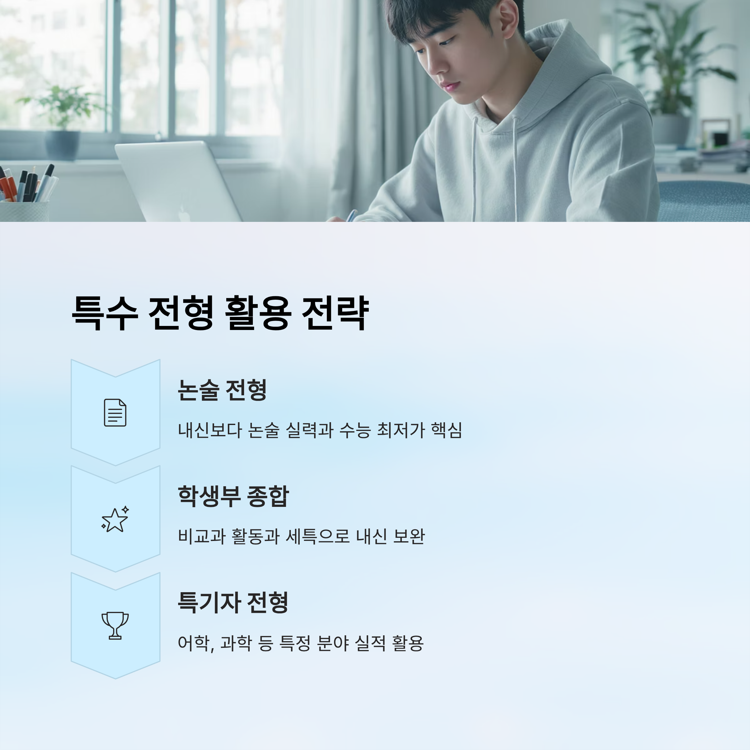 특기자 전형도 간과하면 안 돼요. 어학 특기자, 과학 특기자 등 분야별로 실적이나 능력을 인정받는 전형이 존재해요. 예를 들어 한국외대는 외국어 관련 경시대회 입상, 해외 경험 등이 있으면 경쟁력이 생기고, 일부 예술대학은 작품 포트폴리오로 평가하기 때문에 내신 성적의 부담이 덜해져요.