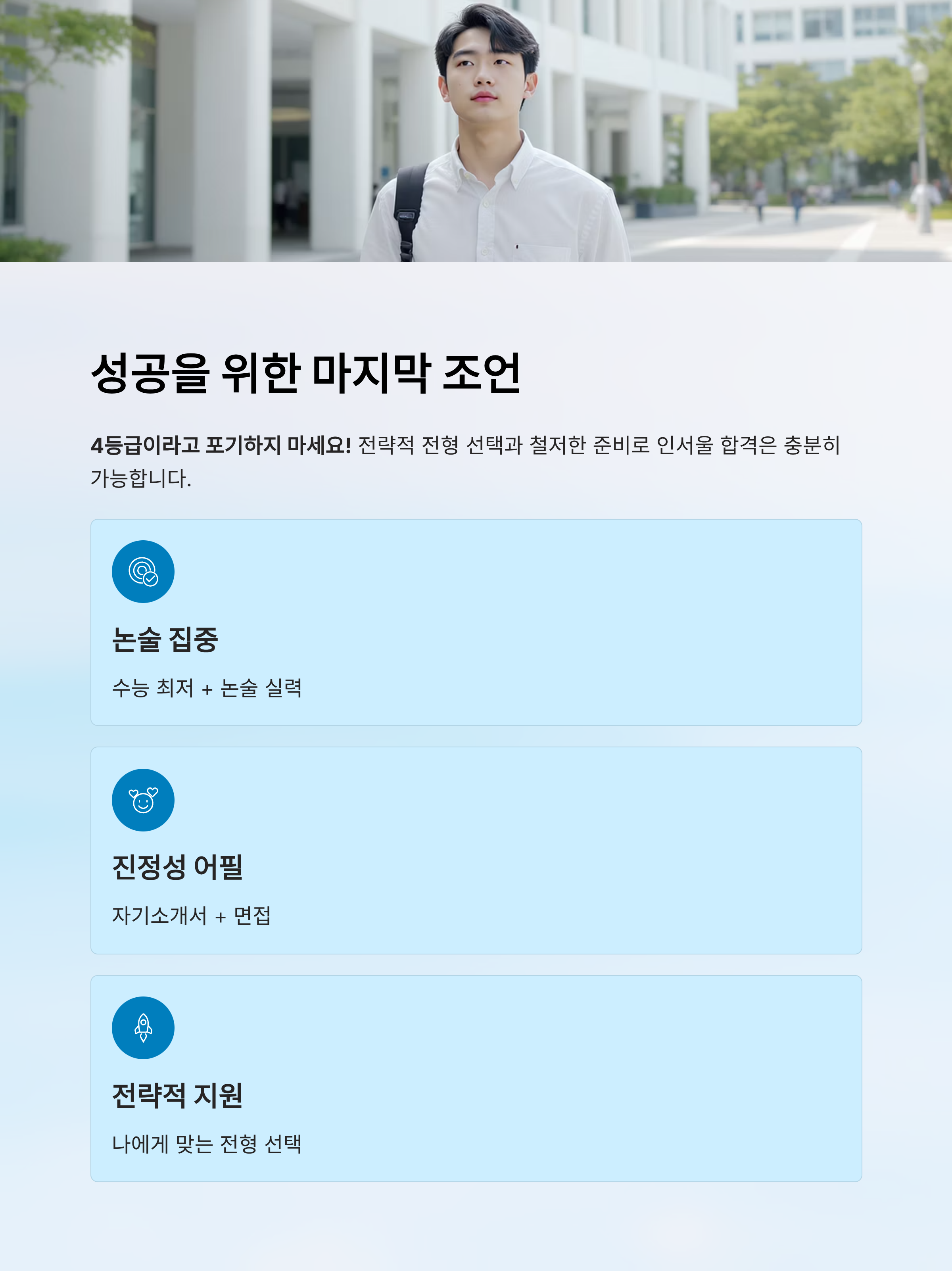 결국 중요한 건 “나만의 무기”를 만드는 거예요. 내신이 부족하다면 논술이나 면접으로, 비교과가 강하다면 학종으로, 특기가 있다면 특기자 전형으로 돌파할 수 있어요. 이런 실질적인 사례들이 보여주듯, 4등급이라도 충분히 인서울 합격은 가능해요. 💡