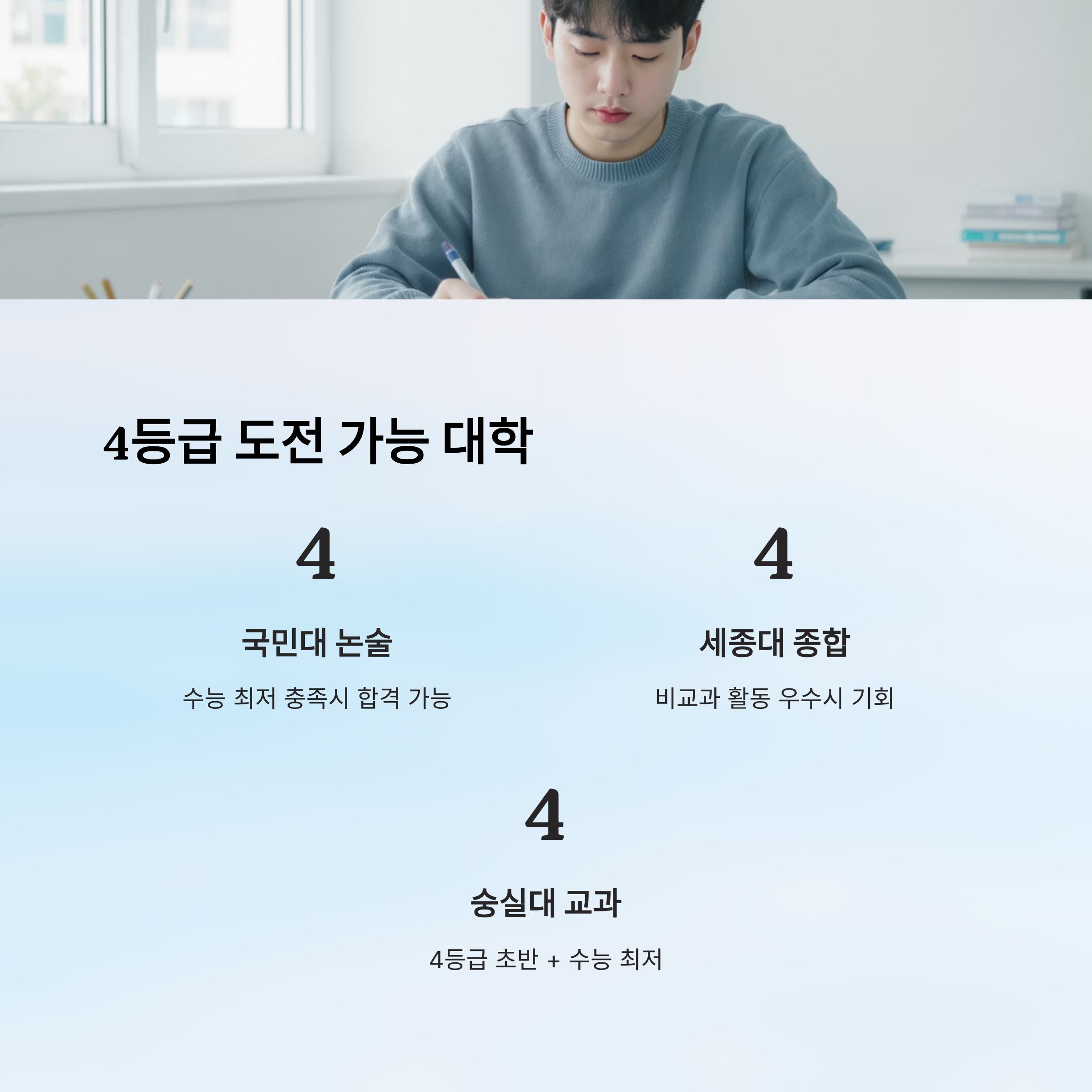 예를 들어 국민대, 세종대, 숭실대, 서울과학기술대 같은 대학들은 교과 전형 외에도 논술 전형이나 학생부 종합 전형을 운영해요. 내신 4등급 학생이라도 비교과 활동이 충실하다면 종합 전형에서 긍정적으로 평가받을 수 있고, 논술 실력이 뛰어나다면 내신을 보완할 수 있어요. 실제로 국민대 논술 전형에서 수능 최저를 맞춘 4등급 학생이 합격한 사례도 있어요.