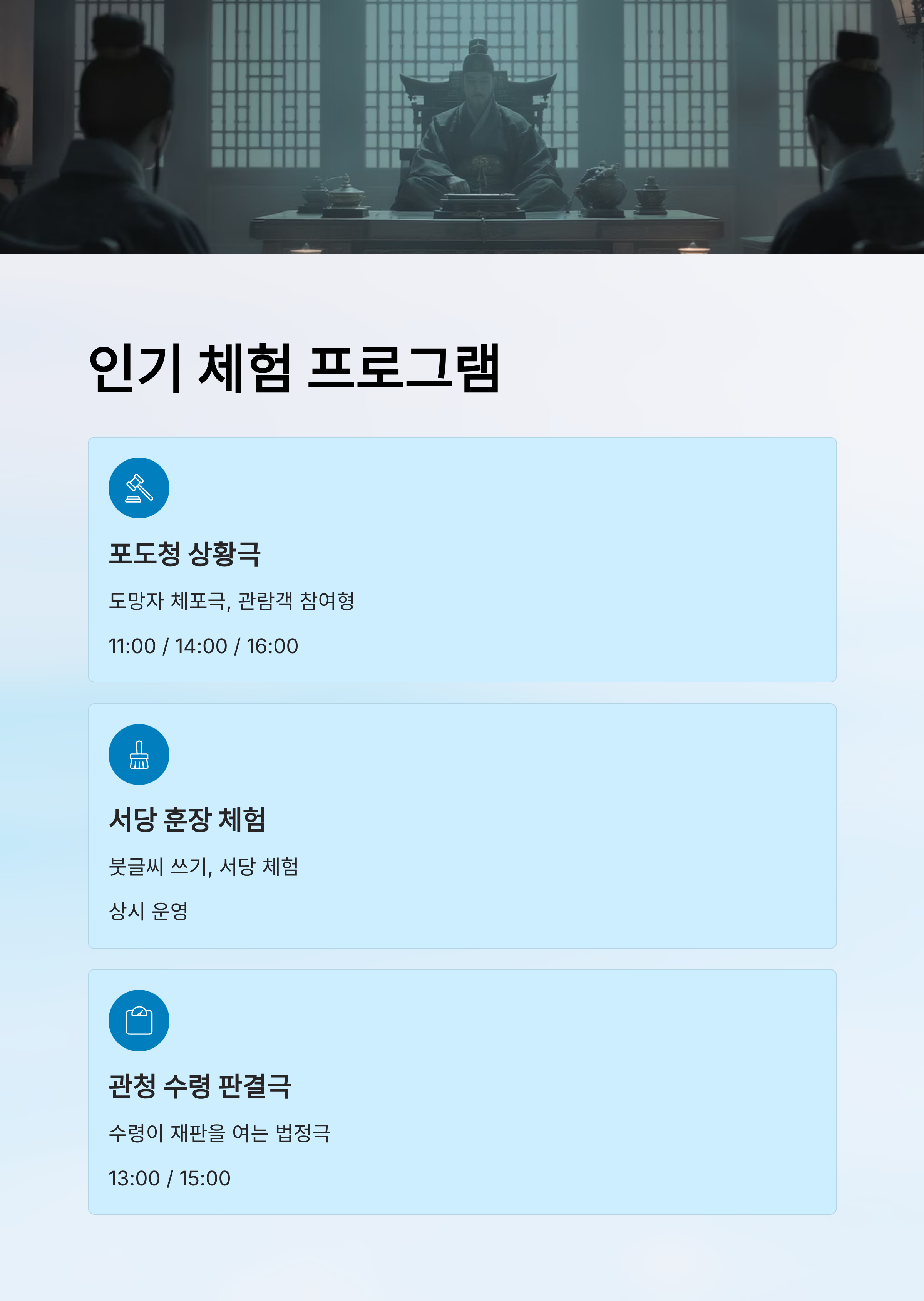 포도청 상황극 | 도망자 체포극, 관람객 참여형 | 11:00 / 14:00 / 16:00 |