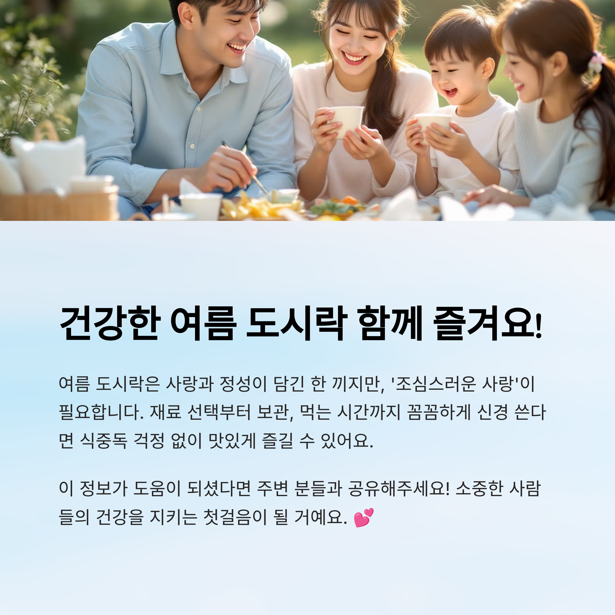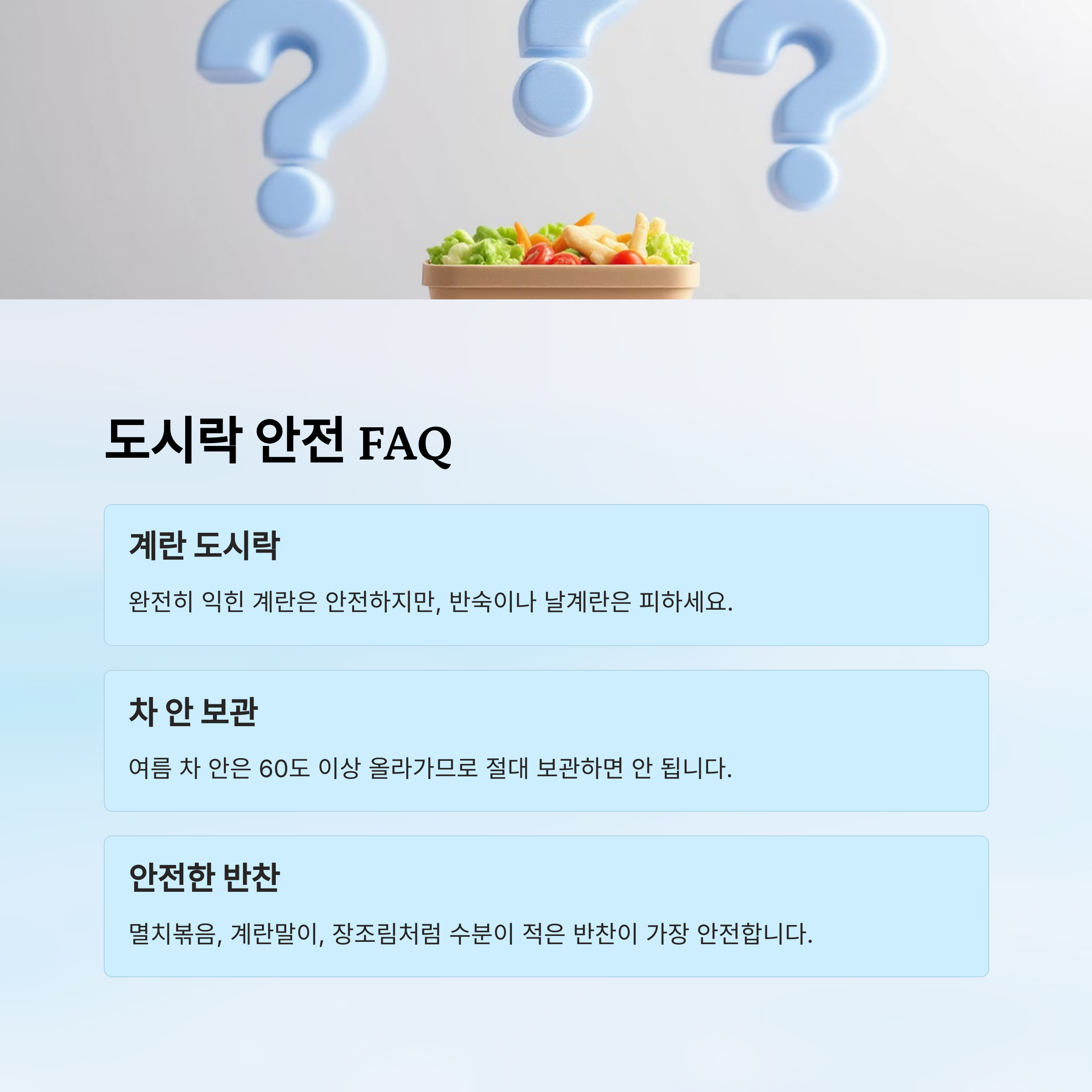 정리하자면, 도시락은 사랑과 정성이 담긴 한 끼지만, 여름철에는 조금 더 ‘조심스러운 사랑’이 필요해요. 재료 선택, 보관, 먹는 시간까지 꼼꼼하게 신경 쓴다면 올여름 도시락은 걱정 없이 즐길 수 있을 거예요 😄