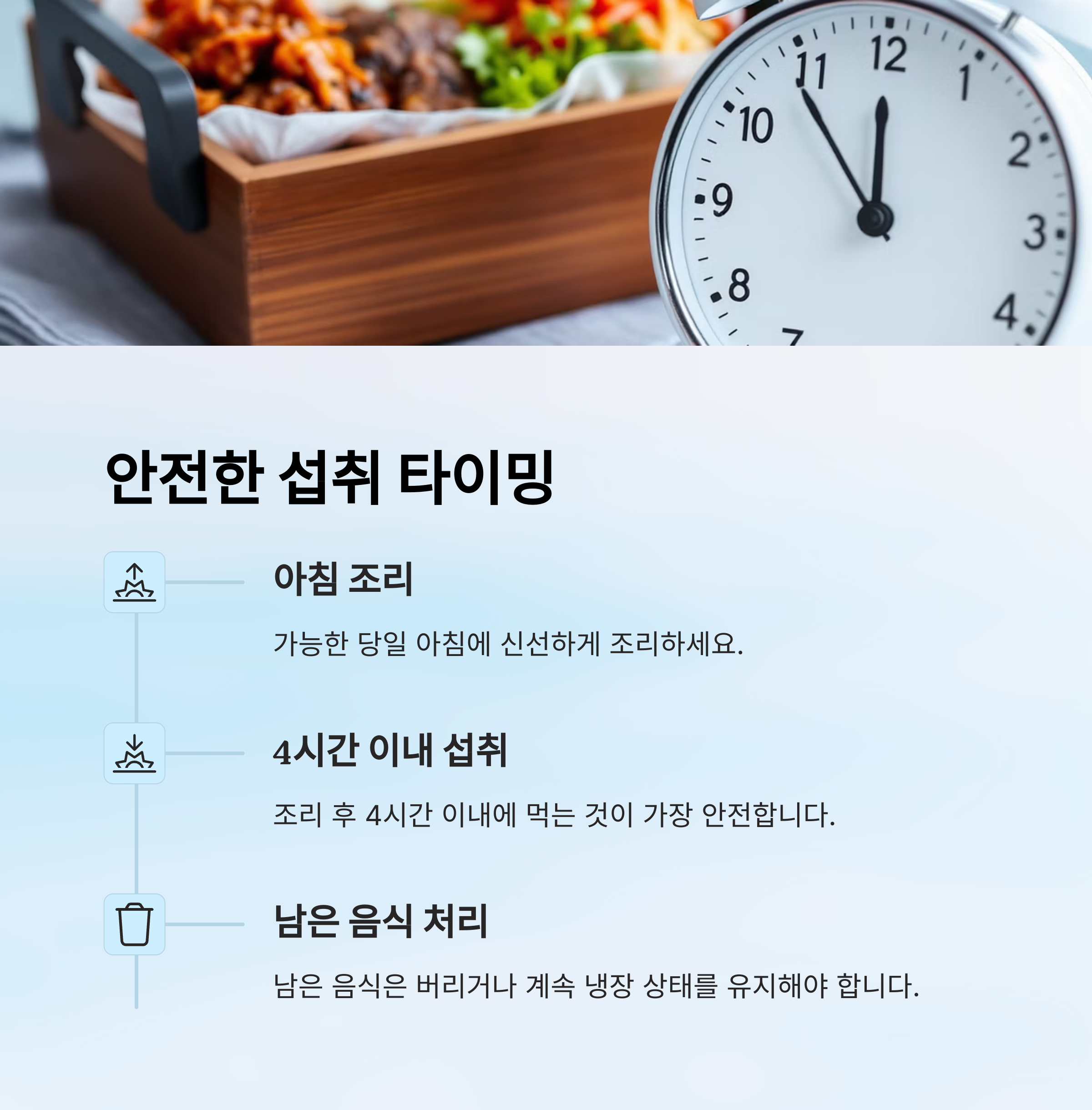 그래서 도시락을 쌀 때는 단순히 “맛있게”만 생각할 게 아니라, “안전하게”를 먼저 고민해야 해요. 도시락의 온도 유지, 재료 상태, 손 씻기 같은 기본적인 위생 수칙이 가장 중요하답니다.
